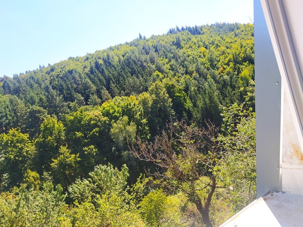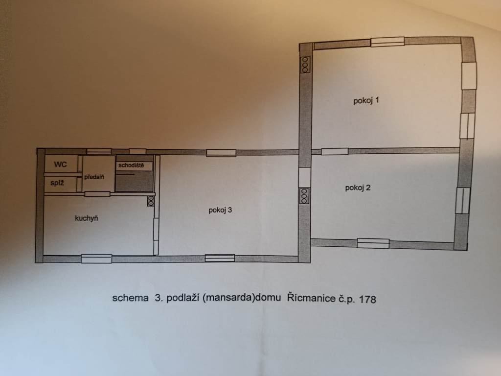 Byt je umístěný v podkroví třípodlažní vily, postavené ve 40.letech minulého století. Vstup do bytu je v úrovni 2. nadzemního podlaží a je společný i pro byt ve 2.NP, který se na této úrovni nachází. Do námi nabízeného se dále pokračuje po schodišti do vyššího podlaží - podkroví, pod novou střechou.