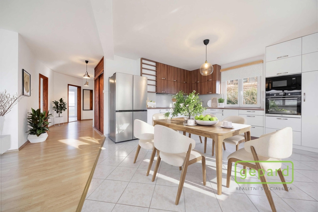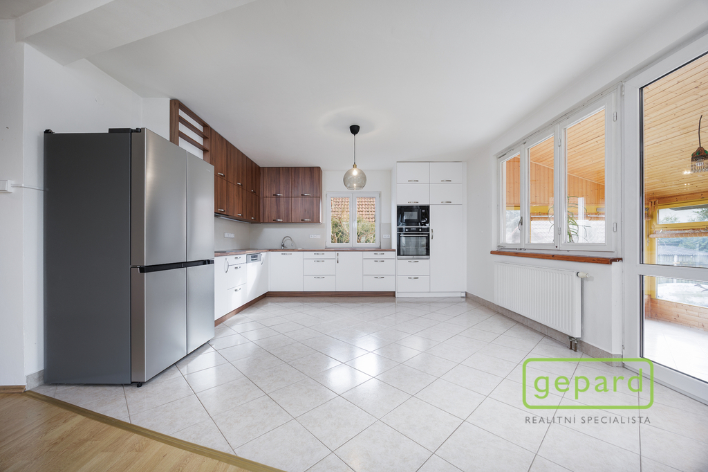 Hlavní obytné patro tvoří moderně zrekonstruovaná kuchyně propojená s obývacím prostorem, který nabízí dostatek místa pro rodinný život i setkávání s přáteli. Z kuchyně se vstupuje do zimní zahrady, která příjemně propojuje dům se zahradou a během jara i podzimu funguje jako přirozený akumulátor slunečního tepla.