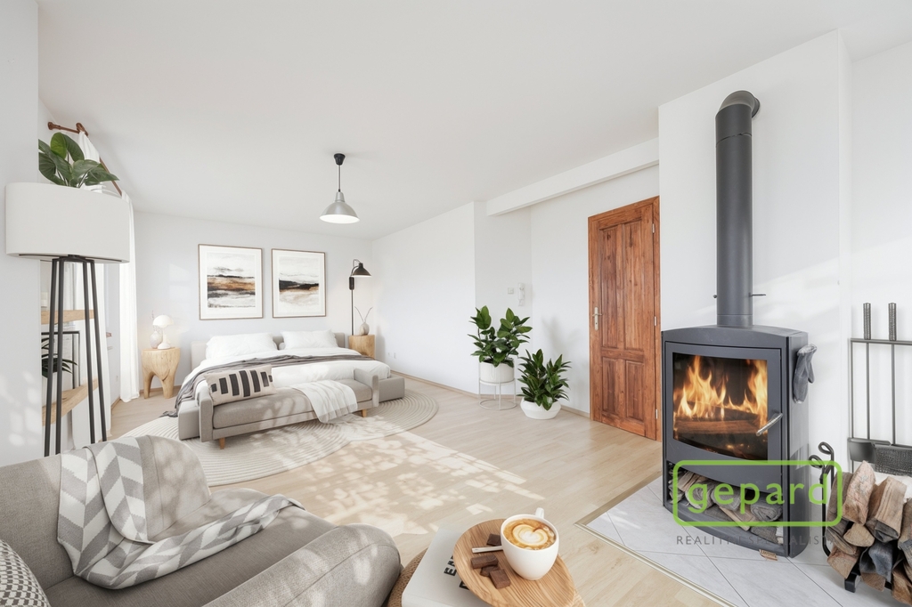 Na obytnou část navazuje samostatný pokoj s krbovými kamny, který vytváří útulnou atmosféru. Ve vizualizacích je představen jako ložnice s čtecím koutkem a knihovnou u kamen, ale může sloužit také jako pracovna, pokoj pro hosty nebo být propojen s obývacím prostorem. Na patře se dále nachází kompletně zrekonstruovaná koupelna, praktická šatna a vstupní předsíň. Interiérové dveře jsou z masivního dřeva.