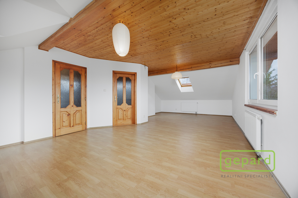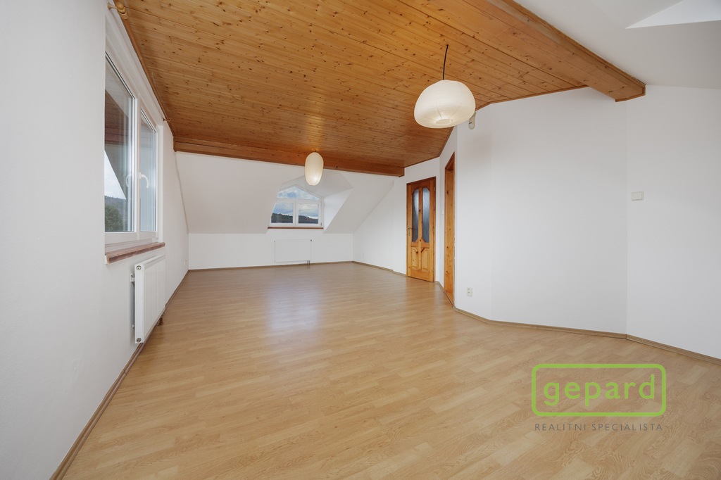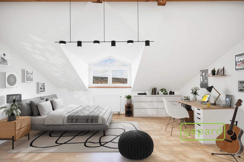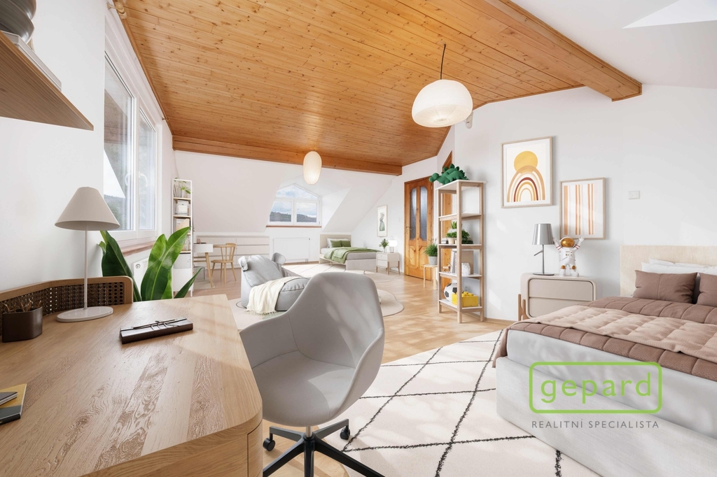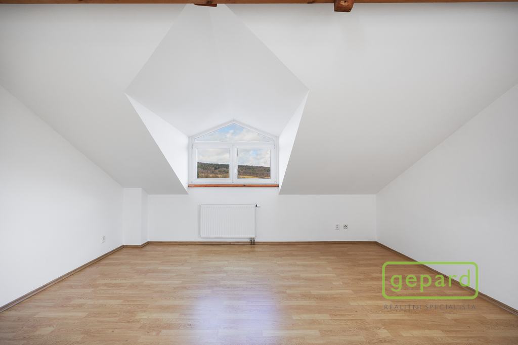Horní patro nabízí tři pokoje a koupelnu s toaletou. Dispozice umožňuje vytvoření samostatné bytové jednotky. Pokoje mají příjemné západní výhledy směrem na Brdy.