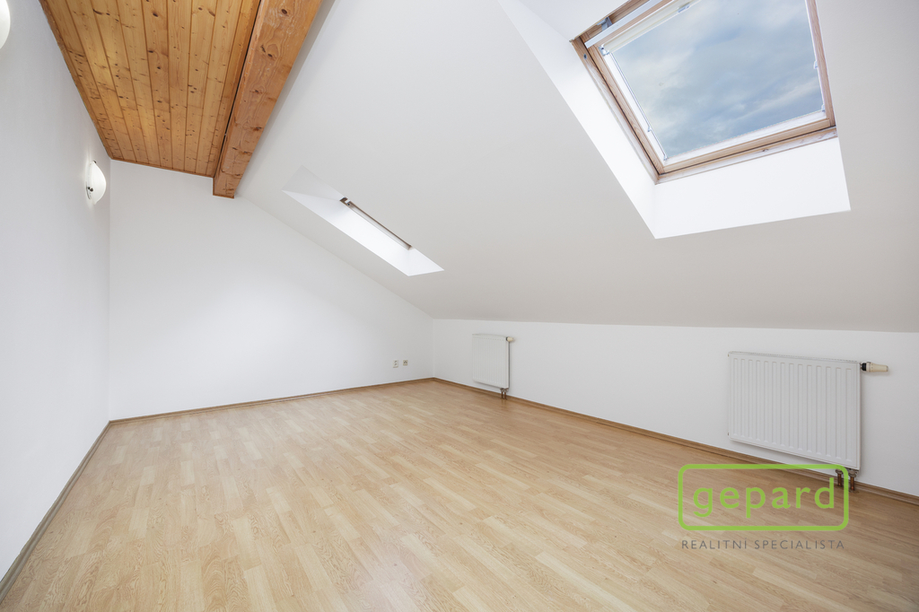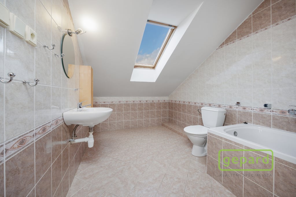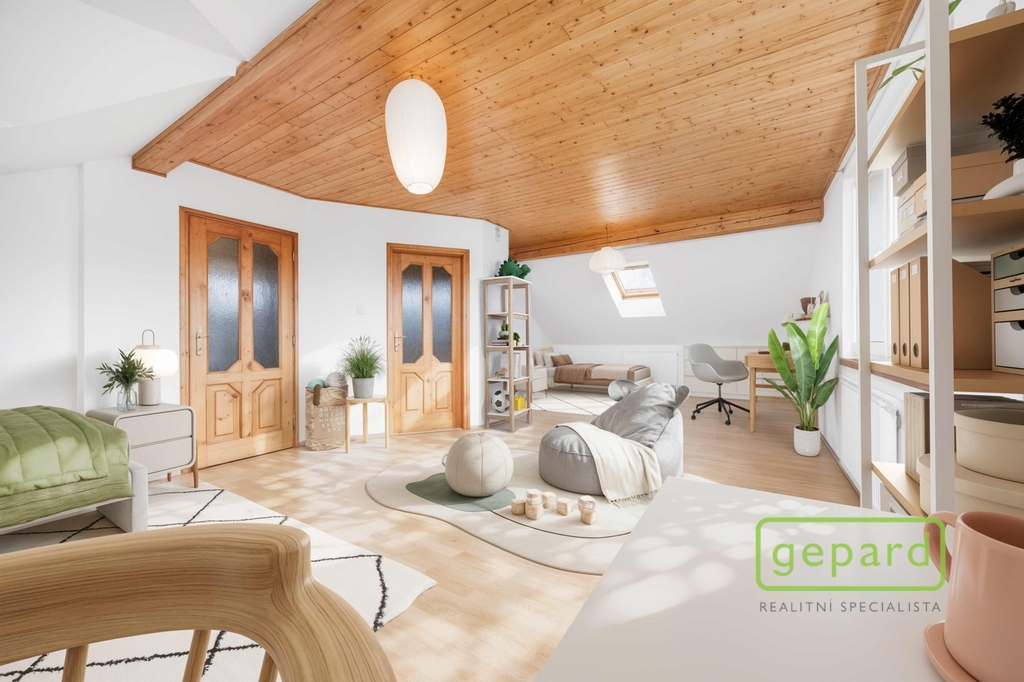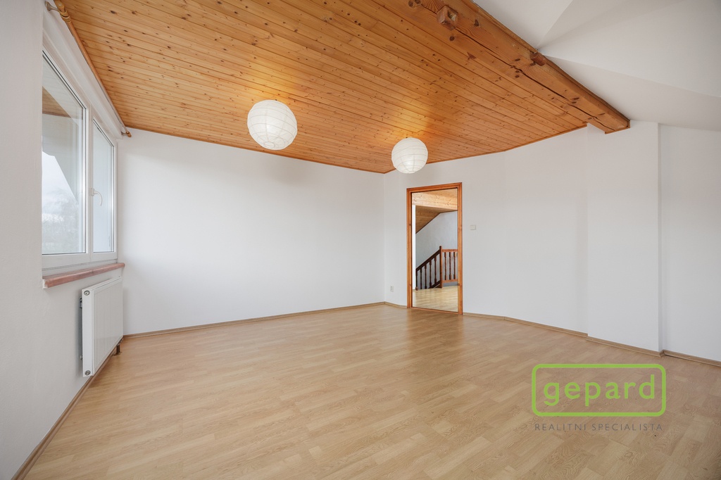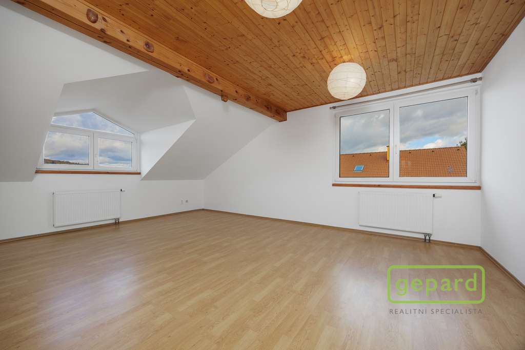 Horní patro nabízí tři pokoje a koupelnu s toaletou. Dispozice umožňuje vytvoření samostatné bytové jednotky. Pokoje mají příjemné západní výhledy směrem na Brdy.