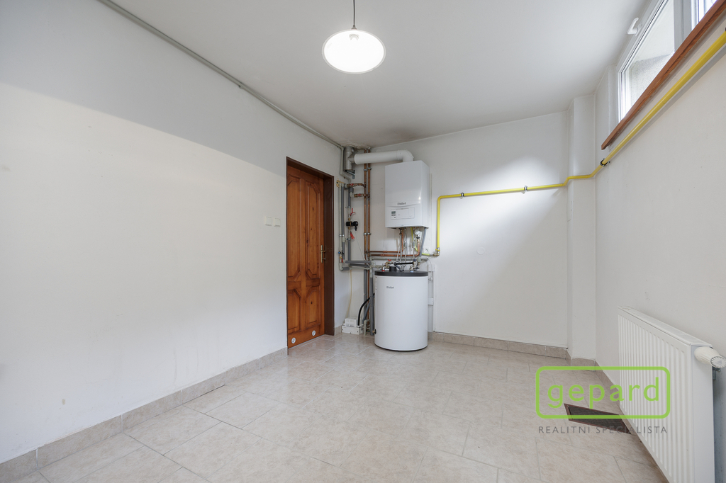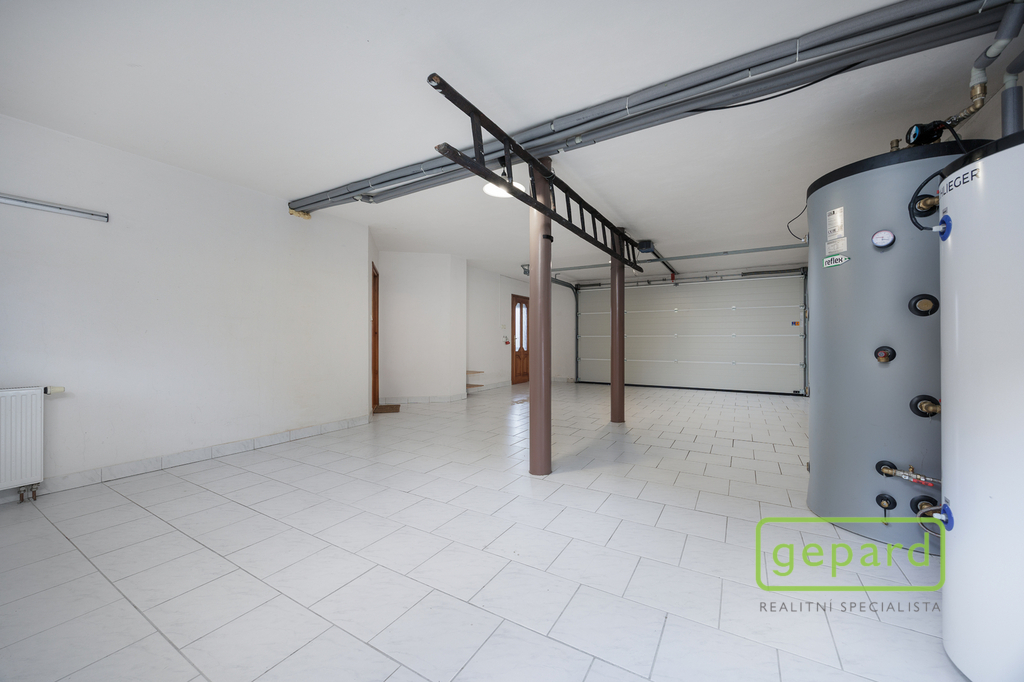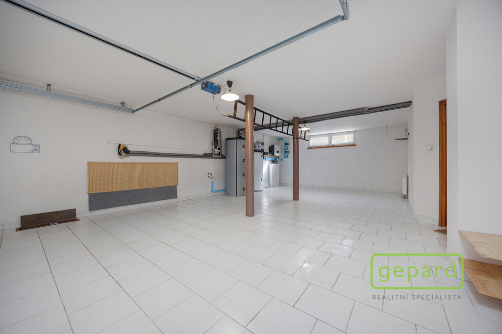 Spodní podlaží nabízí garáž až pro čtyři vozy (aktuálně tři vozy a technické zázemí) s vraty Hörmann a třífázovou zásuvkou. Nachází se zde také technické zázemí domu a samostatná garsoniéra s vlastním příslušenstvím, vhodná pro hosty, rodinu nebo prostor pro podnikání.