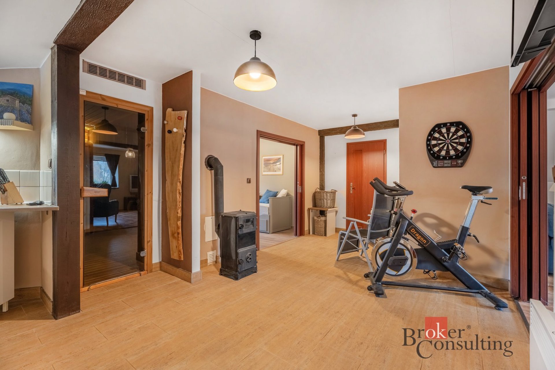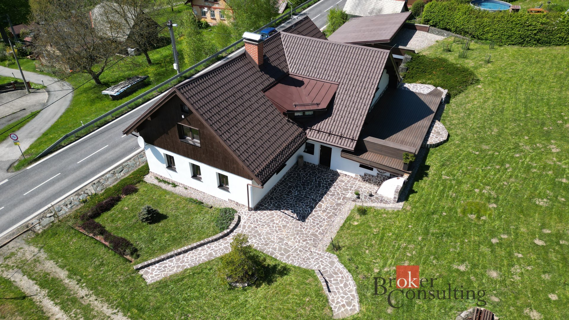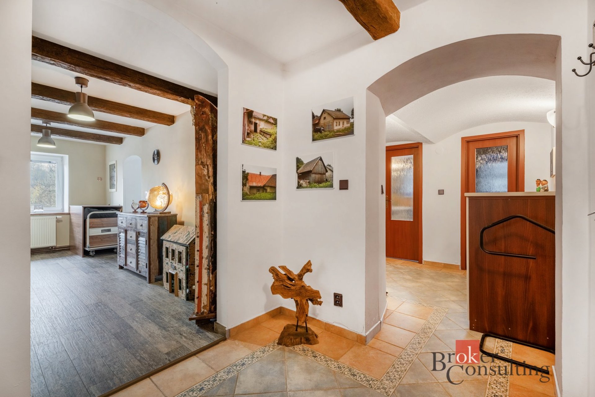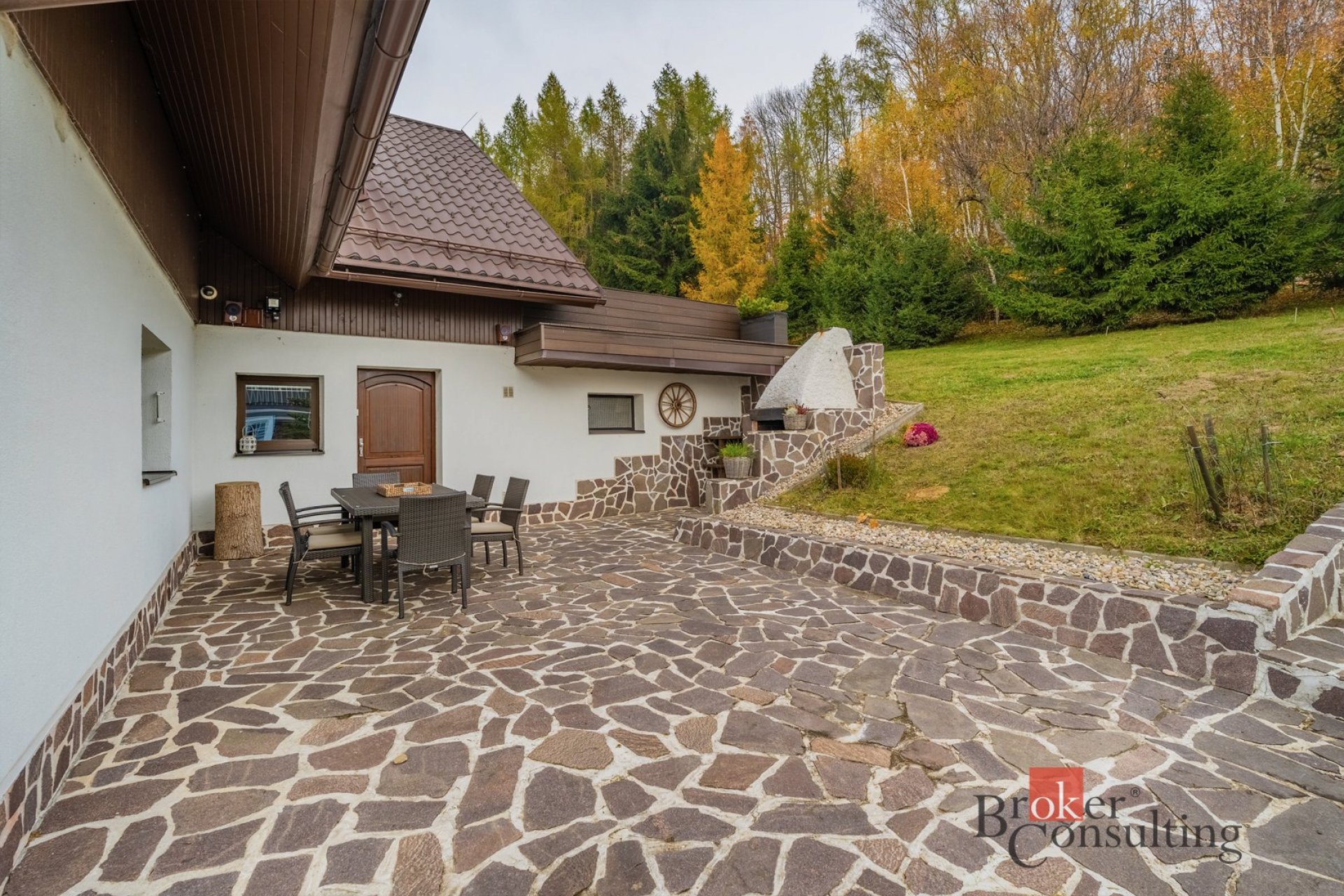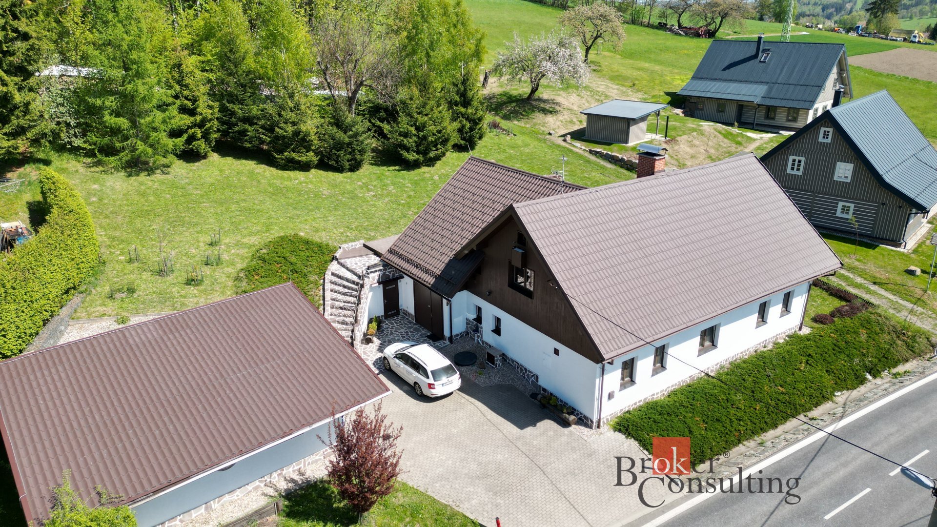 V přízemí se nachází vstupní chodba, kuchyně, pracovna, prostorný obývací pokoj s krbem, koupelna, samostatné WC a průchod do přilehlé kolny s dílnou. V horním podlaží jsou situovány dva obývací pokoje s možností spaní a ložnice, kuchyňka a moderní sauna. K dispozici je čistý půdní prostor pro uskladnění dalších věcí. Podkroví je zatepleno izolační vatou. Celý objekt je střežen kamerovým systémem.