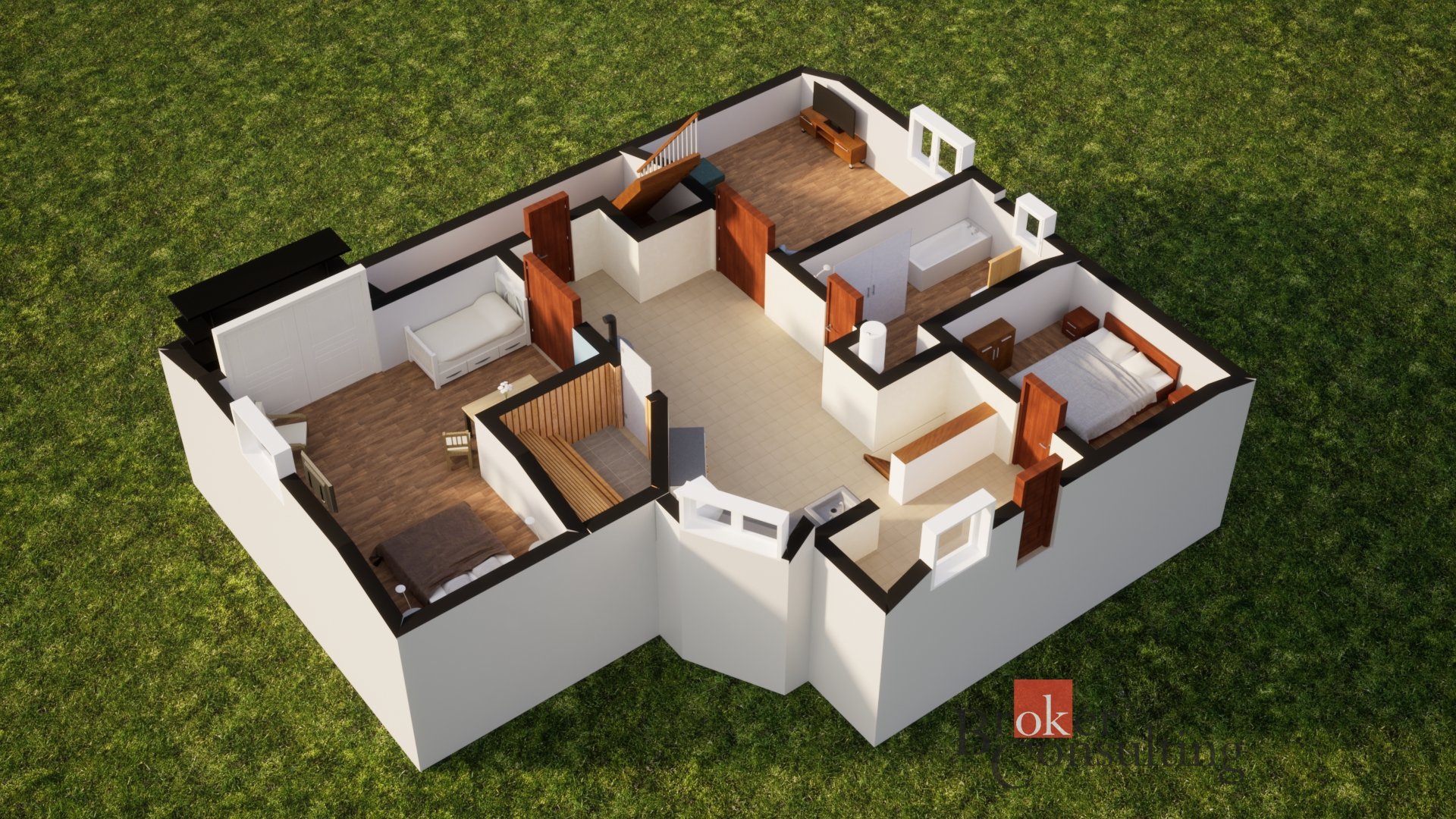 • Energie a sítě: vytápění je zajištěno kombinací krbu s výměníkem a elektrokotle, v patře je klimatizace a přímotopy, ohřev vody bojlerem, díky možnosti vytápění krbem se výrazně snižují náklady na provoz domu, což z něj činí úsporné a energeticky efektivní bydlení.