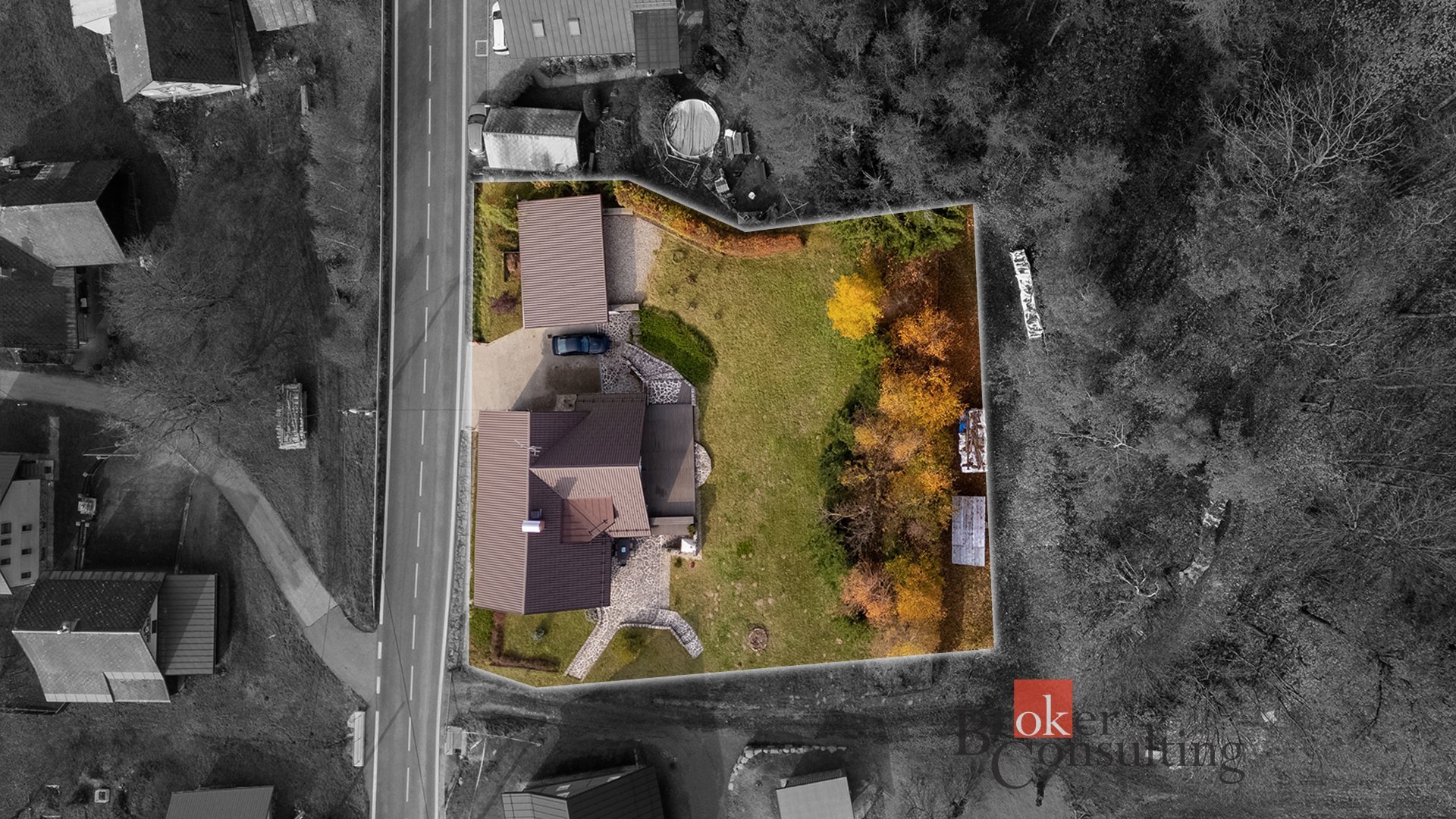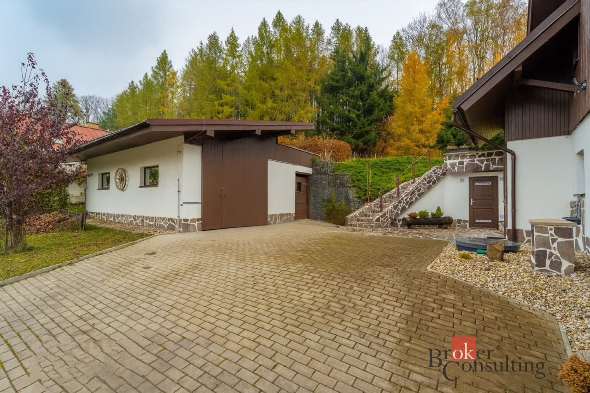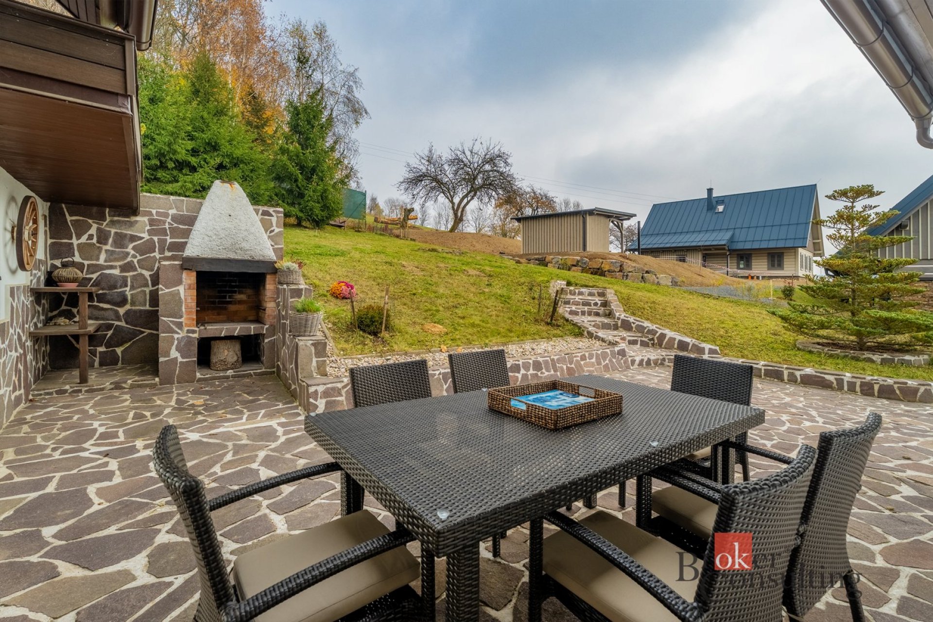 Součástí nabídky je rovněž samostatně stojící garáž se skladovým prostorem. Velkou výhodou je možnost využití horní terasy pro letní posezení s výhledem do přírody či spodní kamenné terasy s venkovním krbem, které je ideální pro setkání s přáteli při grilování.