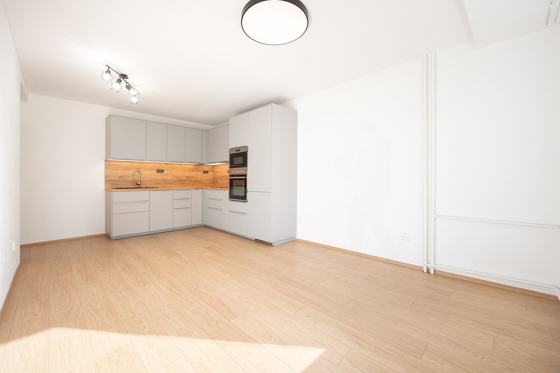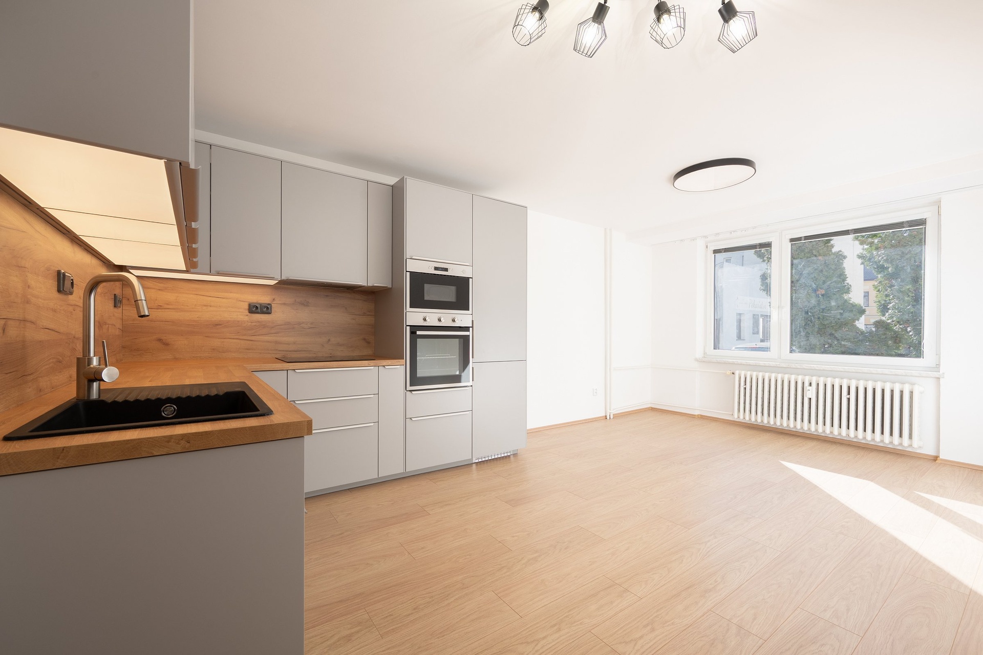 - vše v bytě je nové – elektrické rozvody, omítky, podlahy, dveře i veškeré vybavení kuchyně a koupelny