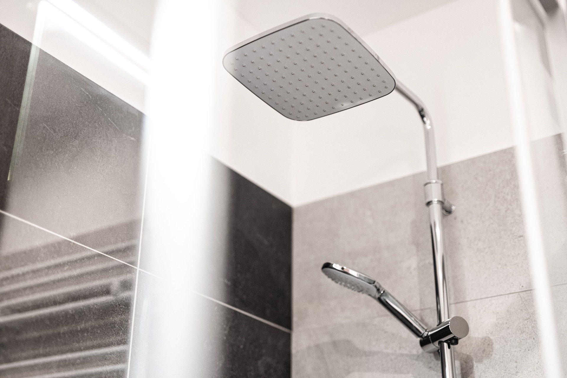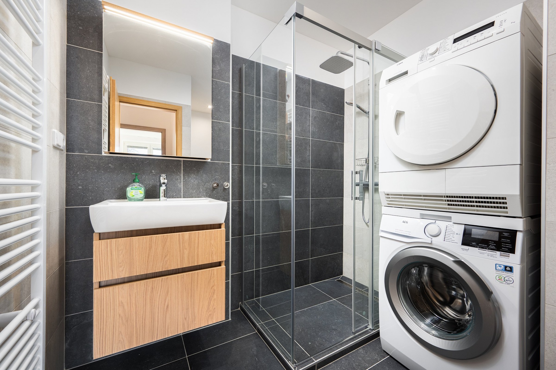 Koupelna s toaletou je prostorná s velkým sprchovým koutem. Je zde také umístěna pračka se sušičkou.
