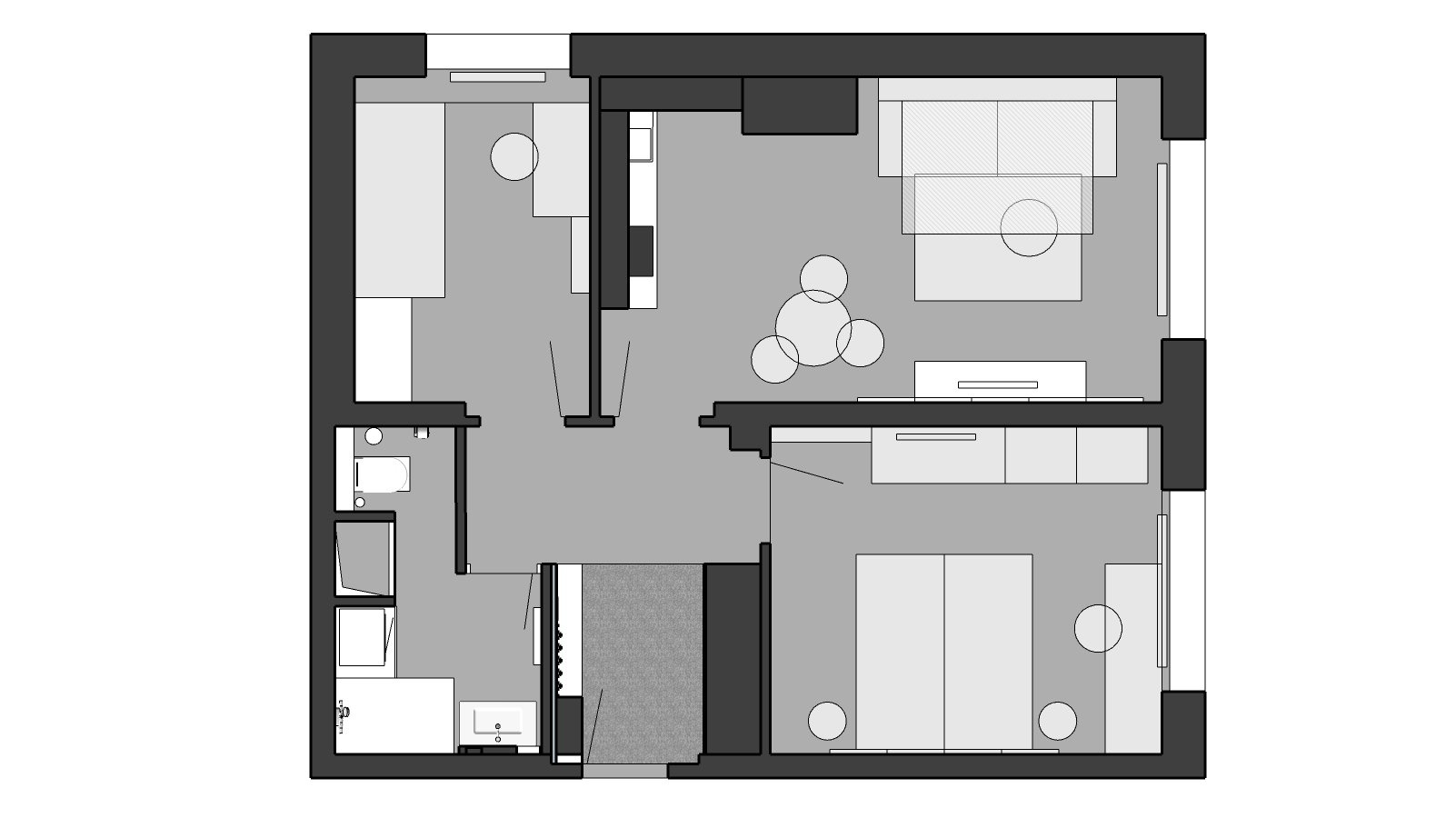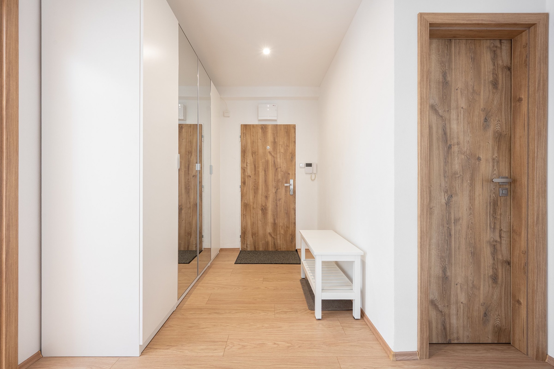 Vstupní chodba bytu je vybavena šatní skříní. Je zde i dostatek místa na botník a odkládání obuvi. Velkoformátové zrcadlo prostor opticky zvětšuje a prosvětluje. Chodba je centrem celého bytu, z níž se vstupuje do jednotlivých neprůchozích pokojů a koupelny.
