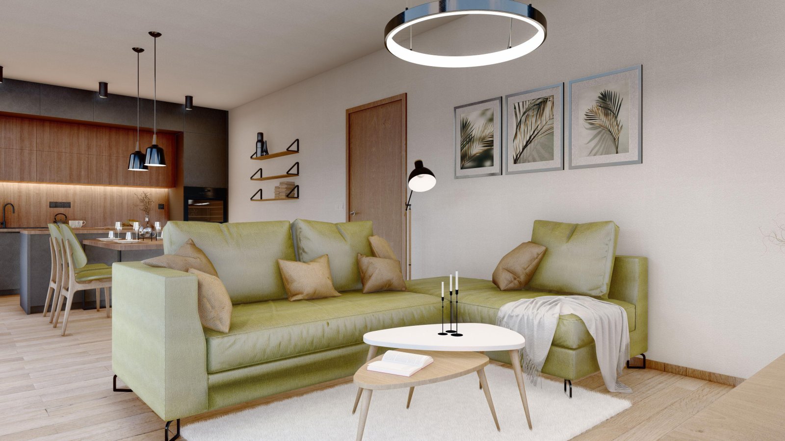 Dispozice: 1.NP – vstupní předsíň (4,94 m2), samostatné WC (1,94 m2), obývací pokoj s kuchyňským koutem (21,98m2), z obýváku je vstup na terasu o výměře 10,97 m2, 2x samostatný pokoj/ ložnice (13,96 m2, 10,7 m2), koupelna s WC ?(7,21 m2).