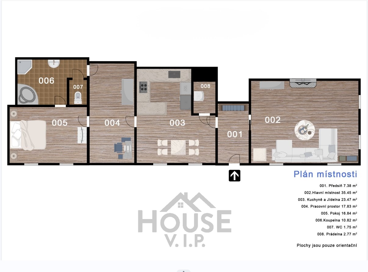 Byt o podlahové ploše 108 m² je situován v 1. nadzemním podlaží udržovaného domu. Dispozice zahrnuje tři samostatné pokoje, samostatnou kuchyni s jídelním koutem, koupelnu, komoru a dostatek úložných prostor. Kuchyň je vybavena moderní kuchyňskou linkou s vestavěnými spotřebiči značky Gorenje a tvoří praktické centrum celé domácnosti.
