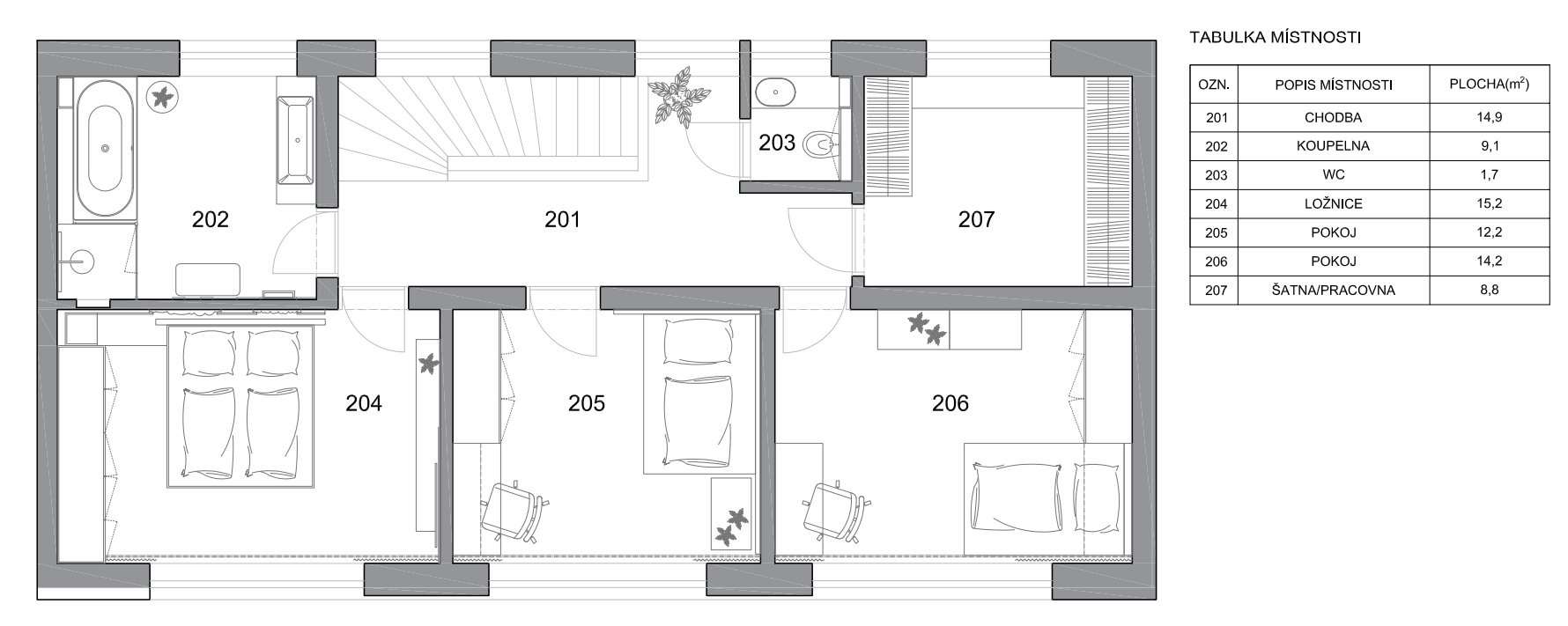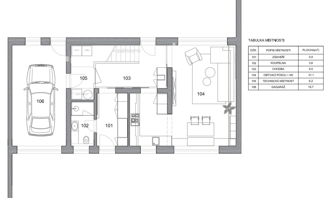 Dům nabízí moderní dispozici s dostatkem prostoru pro celou rodinu. Otevřený obytný prostor s jídelnou a kuchyní, tři pokoje, šatna, technická místnost a prostorné koupelny – vše navrženo s důrazem na pohodlí a praktičnost.