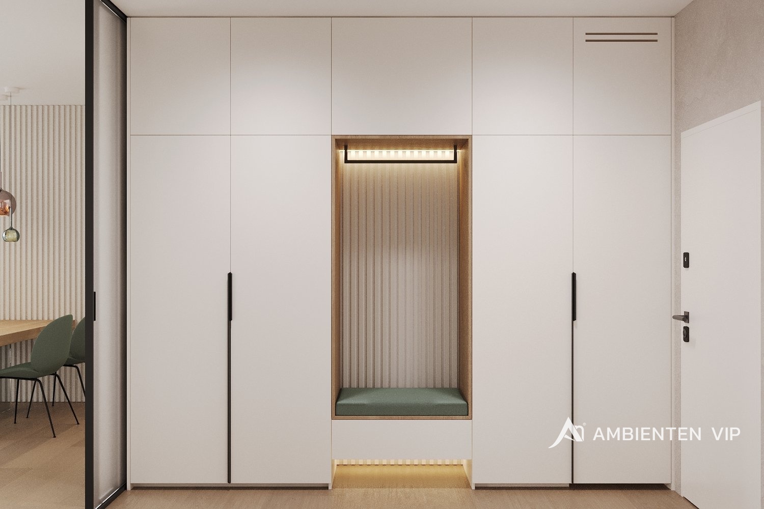 Byt disponuje vstupní halou (5,94 m²), prostorným obývacím pokojem (21,32 m²), kuchyňským koutem s jídelnou (16,24 m²), dvěma ložnicemi (18,80 m² a 17,60 m²), koupelnou s vanou a společném WC (5,80 m²), terasou (8,10 m²) a terasou s přístupem přes společné prostory na střeše budovy (37,8 m²) - lze využít i například pro vířivku.