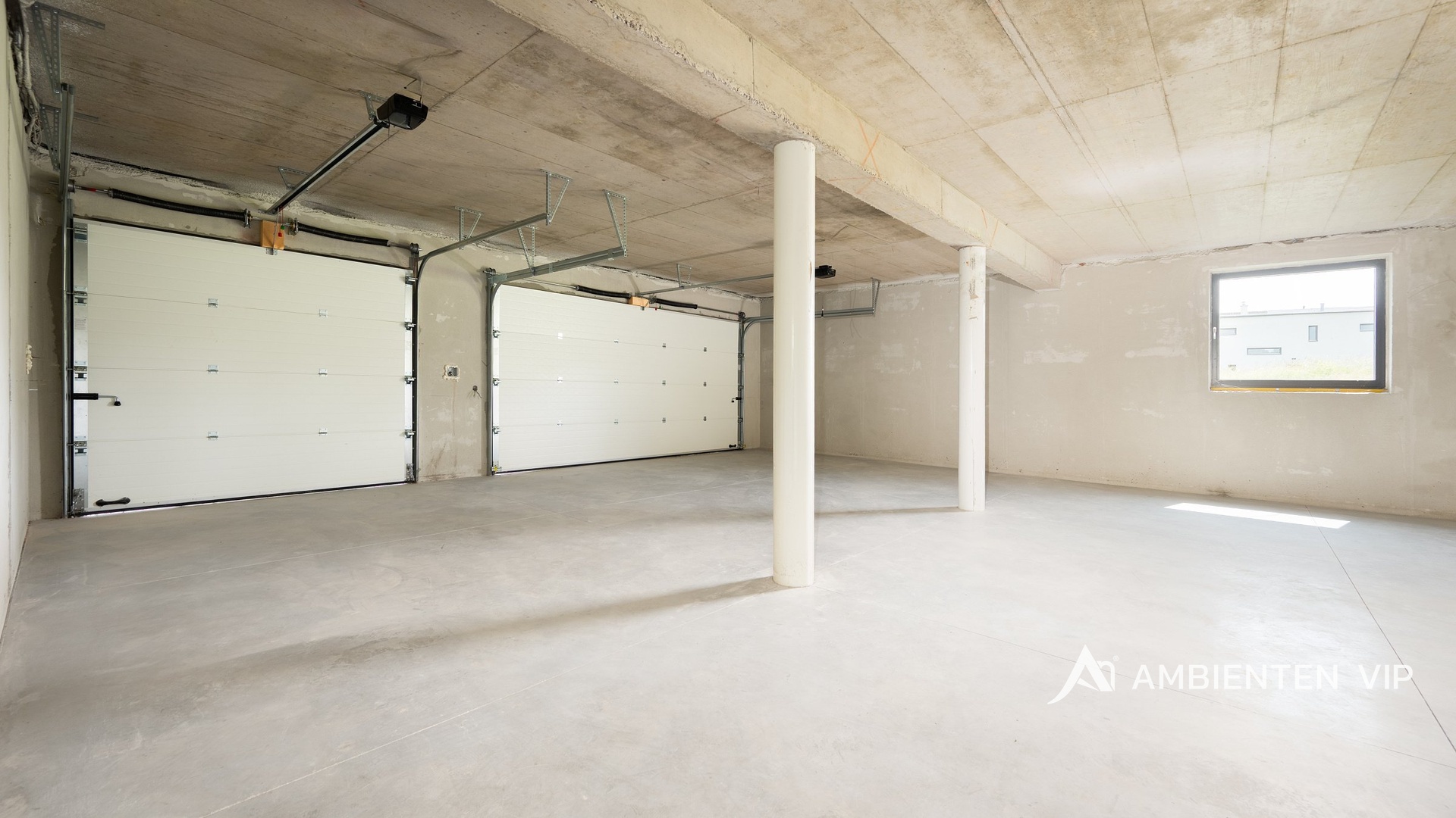 Garáž je určena pro šest vozidel, s třemi elektro dobíjecími stanicemi a s jedním technickým umyvadlem. Vjezd sekčními garážovými vraty, které jsou na dálkové ovládání, popřípadě ovládání aplikací (Loxone). Z garáže je propojení vnitřními dveřmi do společných prostor domu. Prostor garáže je temperován elektrickým podlahovým vytápěním Heatflow.