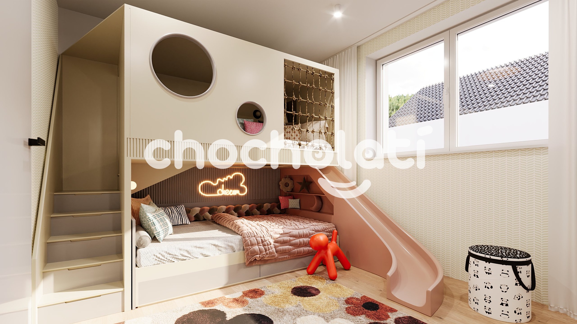 V druhém podlaží se nachází ložnice, dva dětské pokoje a druhá koupelna s WC.