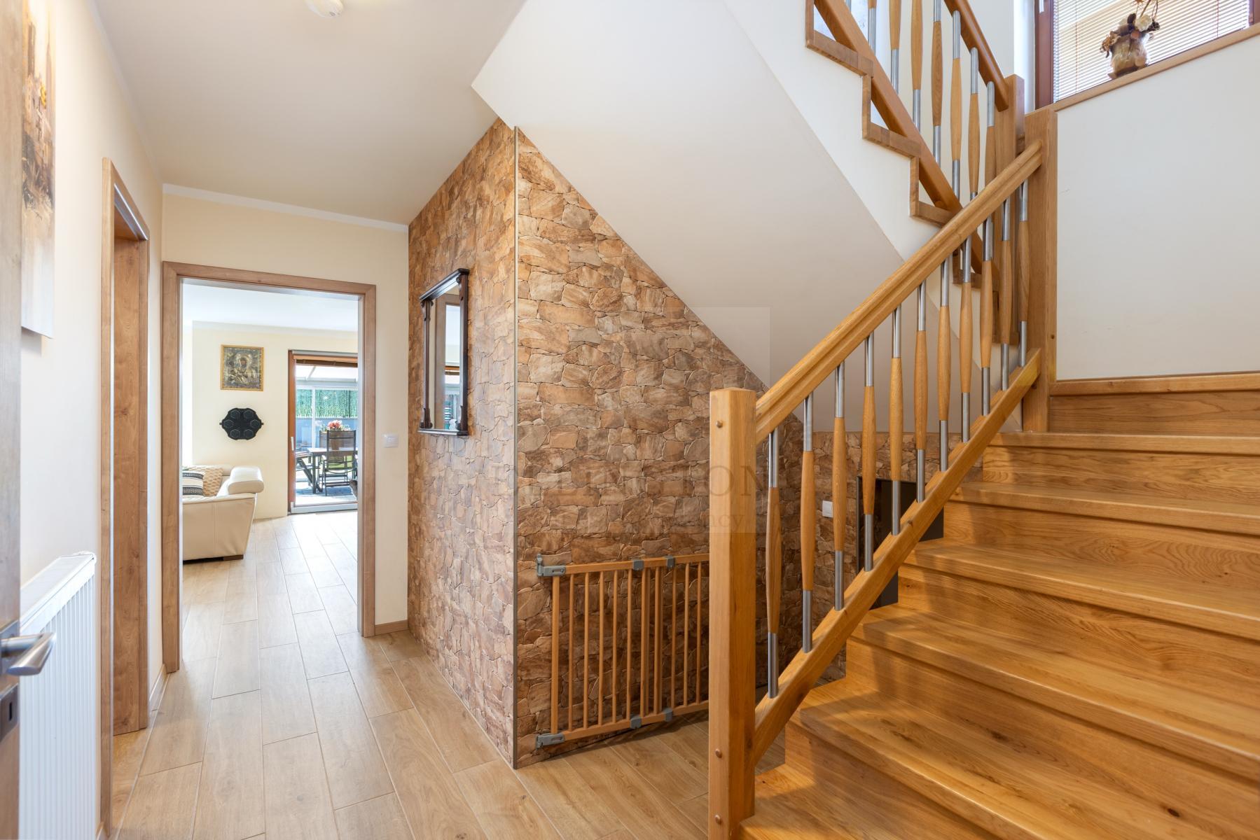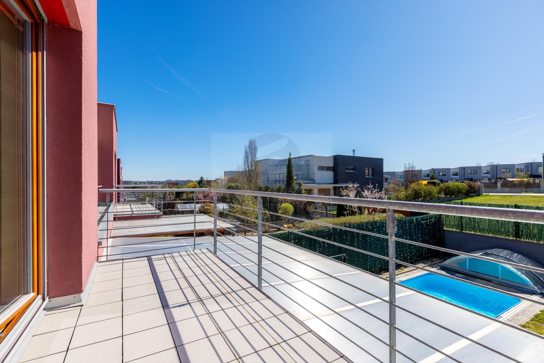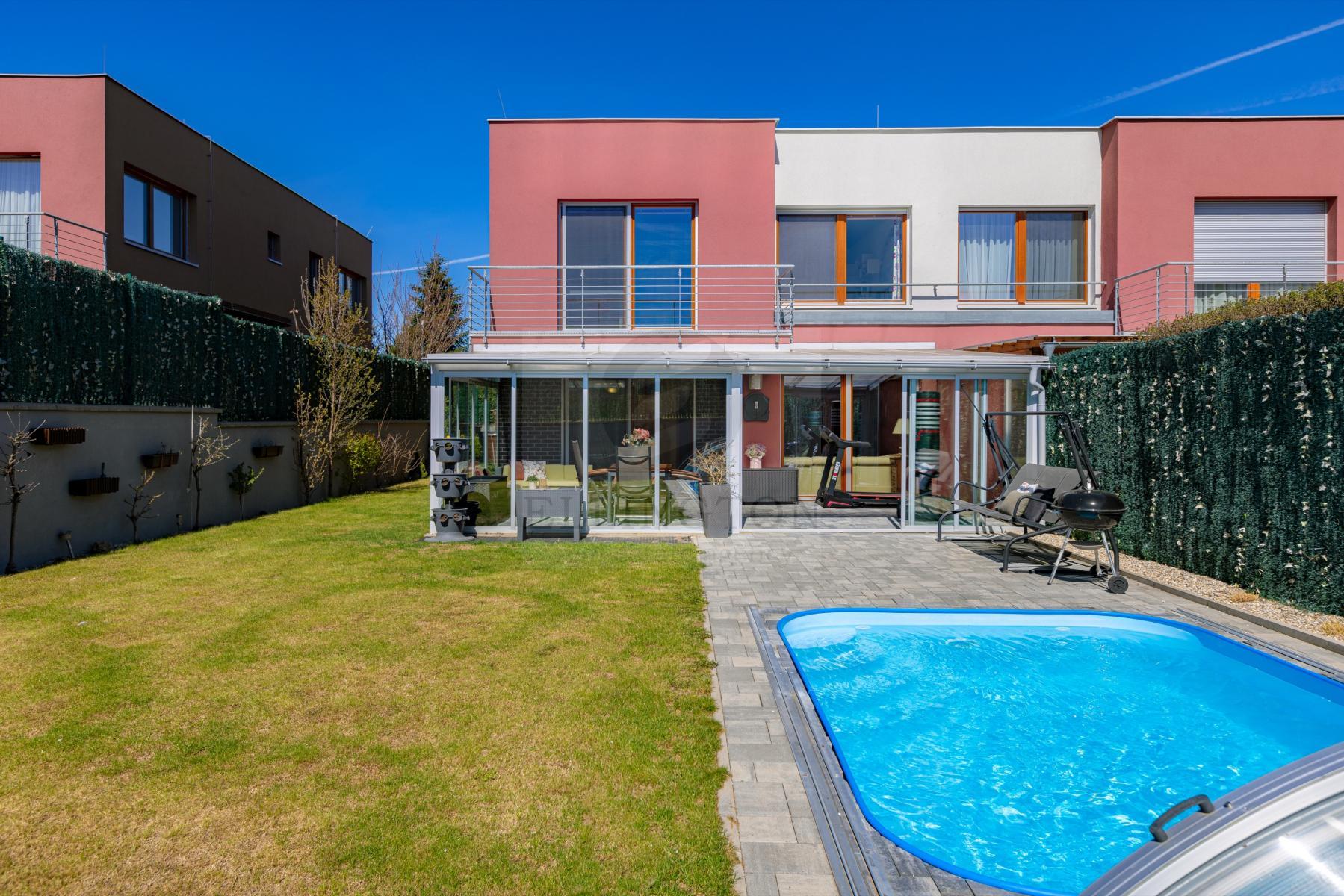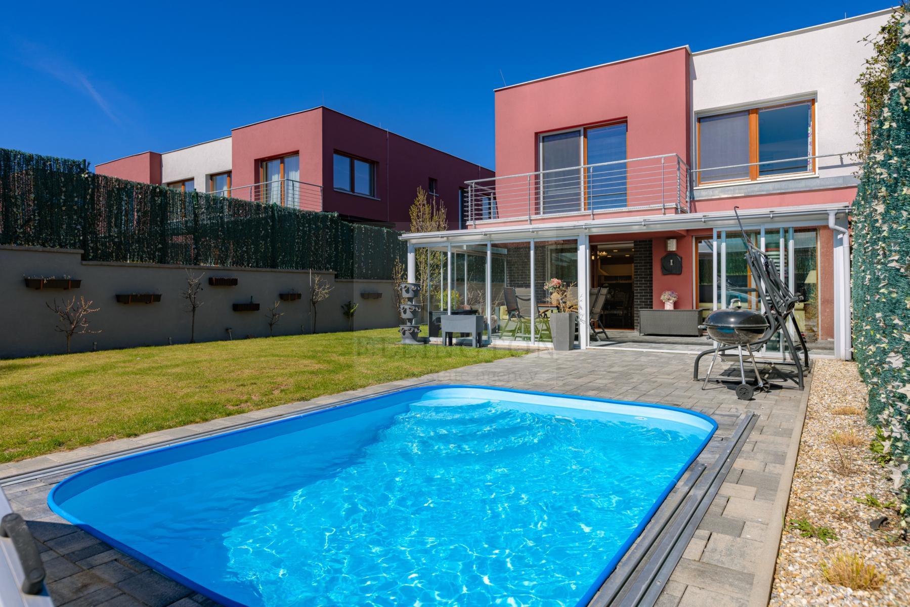 Nabízíme prodej rodinného domu 5+kk na Praze- západ město Roztoky, které se pyšní nejen krásnou přírodní rezervací Tiché údolí, ale i také kompletní občanskou vybaveností včetně škol a školek a přesto kousek od Prahy. Jedná se o novostavbu 5+kk s garáží kolaudovanou v roce 2018 o celkové rozloze 163m2 + 4m2 balkon u ložnice a 8m2 terasy u druhé. Dům stojí na pozemku 381m2. V přízemí domu se nachází zádveří z kterého se vchází do šatny z vest. skříní také samostatná toaleta , technická místnost, infra sauna se sprchovým koutem, která je umístěna v garáži. Dále se vchází do obývacího pokoje s přípravou na krb a plně vybavenou kuchyní spojují s terasou a soukromou zahradou s velkoformátovými okny. Patra spojují masivní dřevěné schodiště se stejném stylu jako jsou parapety a zárubně dveří. V první podlaží se nachází 4 ložnice, z nichž dvě mají vlastní vstup na terasu s výhledem do zahrady. V celém domě byli použity nadstandardní prvky včetně sanity, kompletně zařízený kvalitním nábytkem na míru (lze prodávat i nezařízený). Soukromí horního podlaží doplňuje koupelna s vyhřívanou podlahou (toaleta, vana, sprchový kout) a samostatná toaleta, vše vybaveno sanita Grohe. V přízemí je položena luxusní dlažba Marazzi, v celém domě jsou sádrové omítky, podhledy a všechna okna disponují venkovními žaluziemi na ovládání a sítěmi proti hmyzu. Vytápění domu je řešeno plynovým kotlem Protherm a podlahovými konvektory v kombinaci s s radiátory. Garáž a vstupní brána jsou na dálkové ovládání a bezpečnost celého domu zajišťuje alarm. Zahradní bazén se slanou vodou (4x3 m) a protiproudem na automatické ovládání doplňuje zastřešená terasa, hliníková pergola s plisé roletkami, trávníkový koberec s automatickým zavlažováním a zahradní domek. Velmi pěkné bydlení které vnese do života soukromí a výjimečný komfort. Možnost hradit i hypotečním úvěrem s kterým vám i velice rádi pomůžeme. Vzhledem k lokalitě tuto nabídku doporučujeme. Nutno vidět.