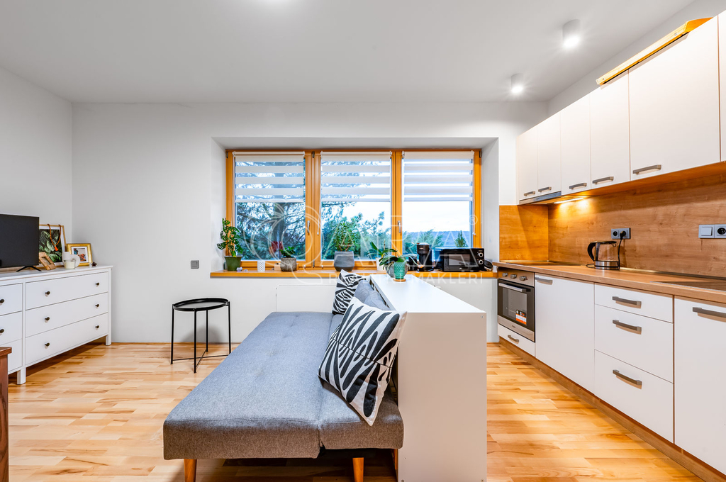 Druhá bytová jednotka má separátní vchod ze zahrady. Dispozice 2kk se skládá z obývacího pokoje s kuchyňským koutem, ložnice s přímým vstupem na vlastní terasu, koupelna a oddělená toaleta.