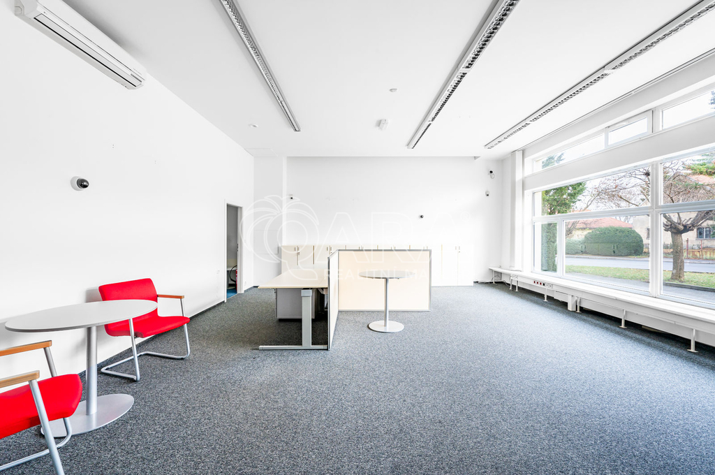 Výhodou je také parkování přímo za budovou. Výborná dopravní dostupnost do metropole jak autem tak veřejnou dopravou (18 min vlakem na Masarykovo nádraží, 10 min autem do Dejvic). Prostory jsou na velmi frekventované ulici.