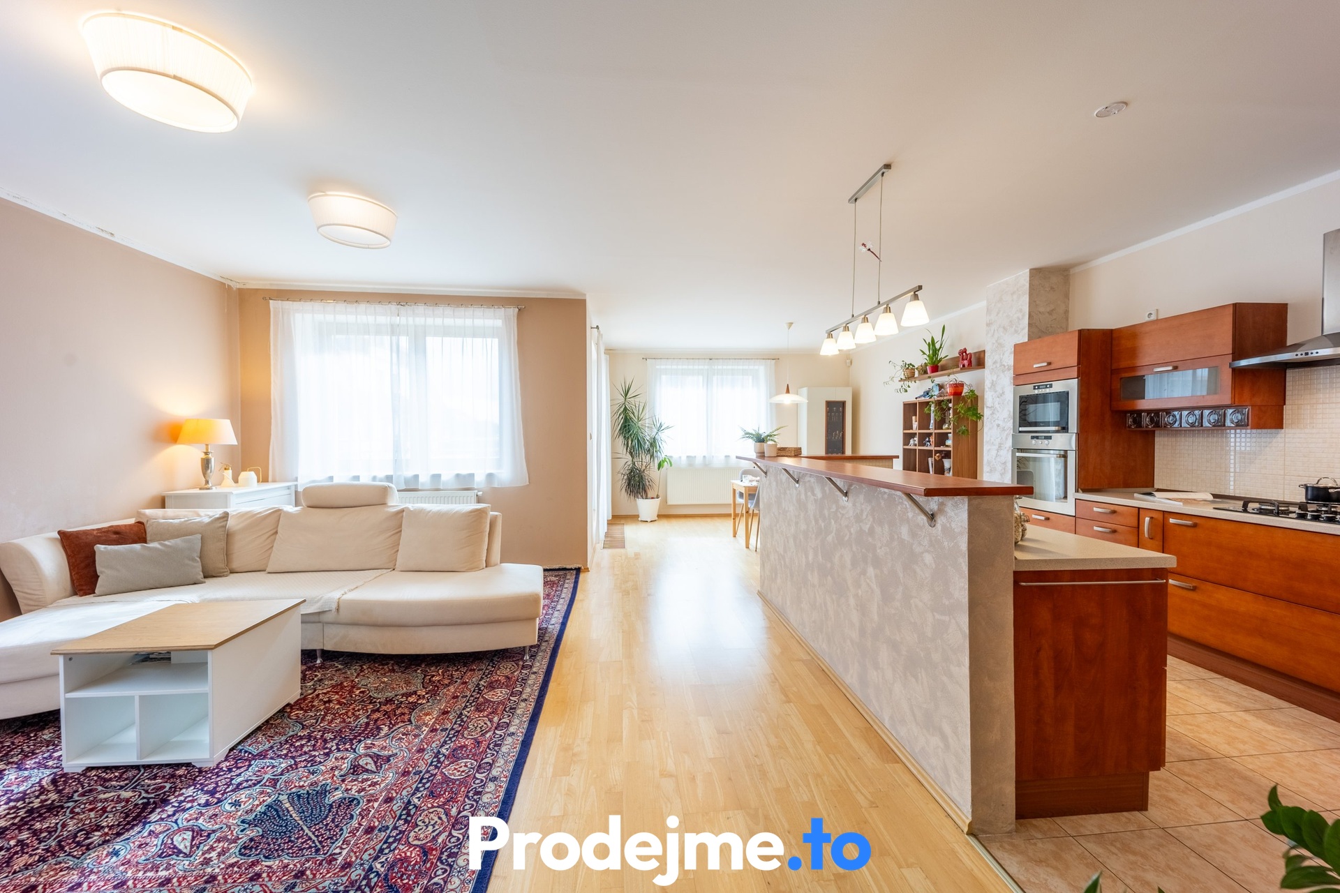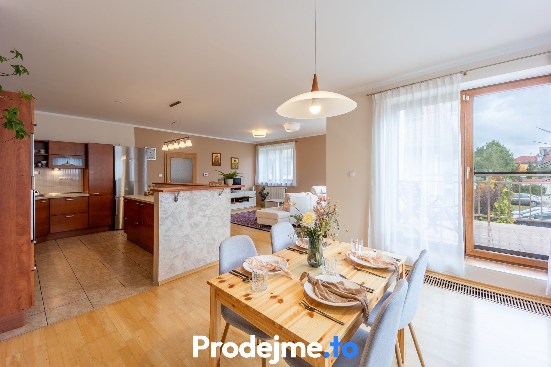 Byt má vlastní vchod v přízemí, obytná část je v prvním patře. Dominantou je velkorysý obývací pokoj s kuchyňským koutem a jídelnou o ploše 50,7 m² a s výborným přirozeným světlem. Kuchyň je plně vybavená (mimo lednici), doplněná o ostrůvek a poskytuje dostatek místa pro vaření i rodinné setkávání. Z jídelny se vstupuje na terasu - ideální pro ranní kávu i letní posezení.