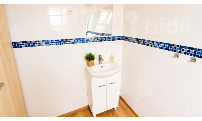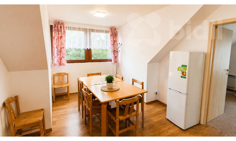 Jedná se o podkrovní byt, který je jedinou bytovou jednotkou v podkroví domu, zatímco v prvním nadzemním podlaží se nacházejí další dva byty. Dispozičně je byt řešen tak, že po vstupu po schodišti se dostanete do centrální části bytu, kde se nachází kuchyně. Kuchyně tvoří hlavní obytný prostor uprostřed bytu, odkud je přístup do jednotlivých pokojů - vlevo se nachází větší pokoj a z druhé strany menší pokoj. Součástí bytu je koupelna se s vanou a toaletou. Byt je vybaven dle fotografií, lze vystěhovat nábytek dle potřeb nájemce. Dům je zateplen a vybaven novými okny, což přispívá k příjemnému a úspornému bydlení. K domu náleží vlastní parkoviště, pozemek není oplocen.