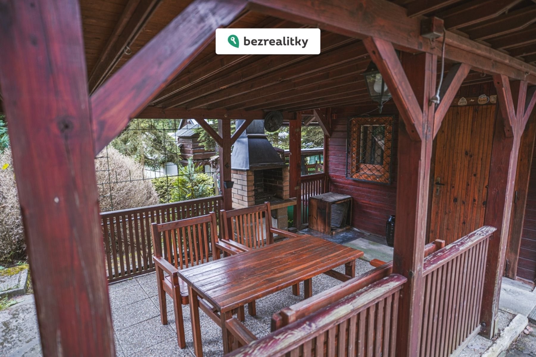 - Pergola s grilem a dřevěným zahradním posezením