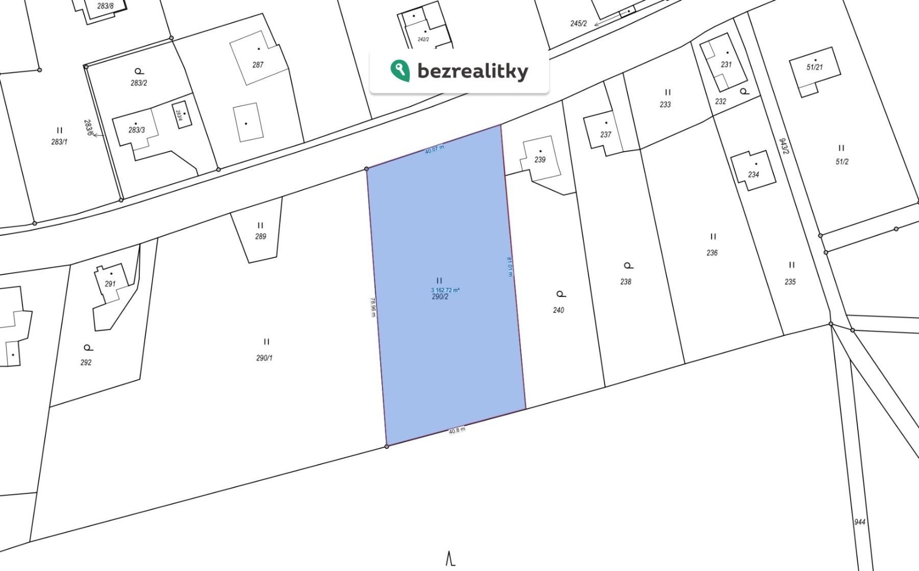 Pozemek je rovinatý, dobře přístupný přímo z obecní komunikace a dle územního plánu je přibližně ze dvou třetin určen k bydlení venkovského typu. Zadní část tvoří pás navazující na lesní porost, který přirozeně zajišťuje soukromí a omezuje další zástavbu.