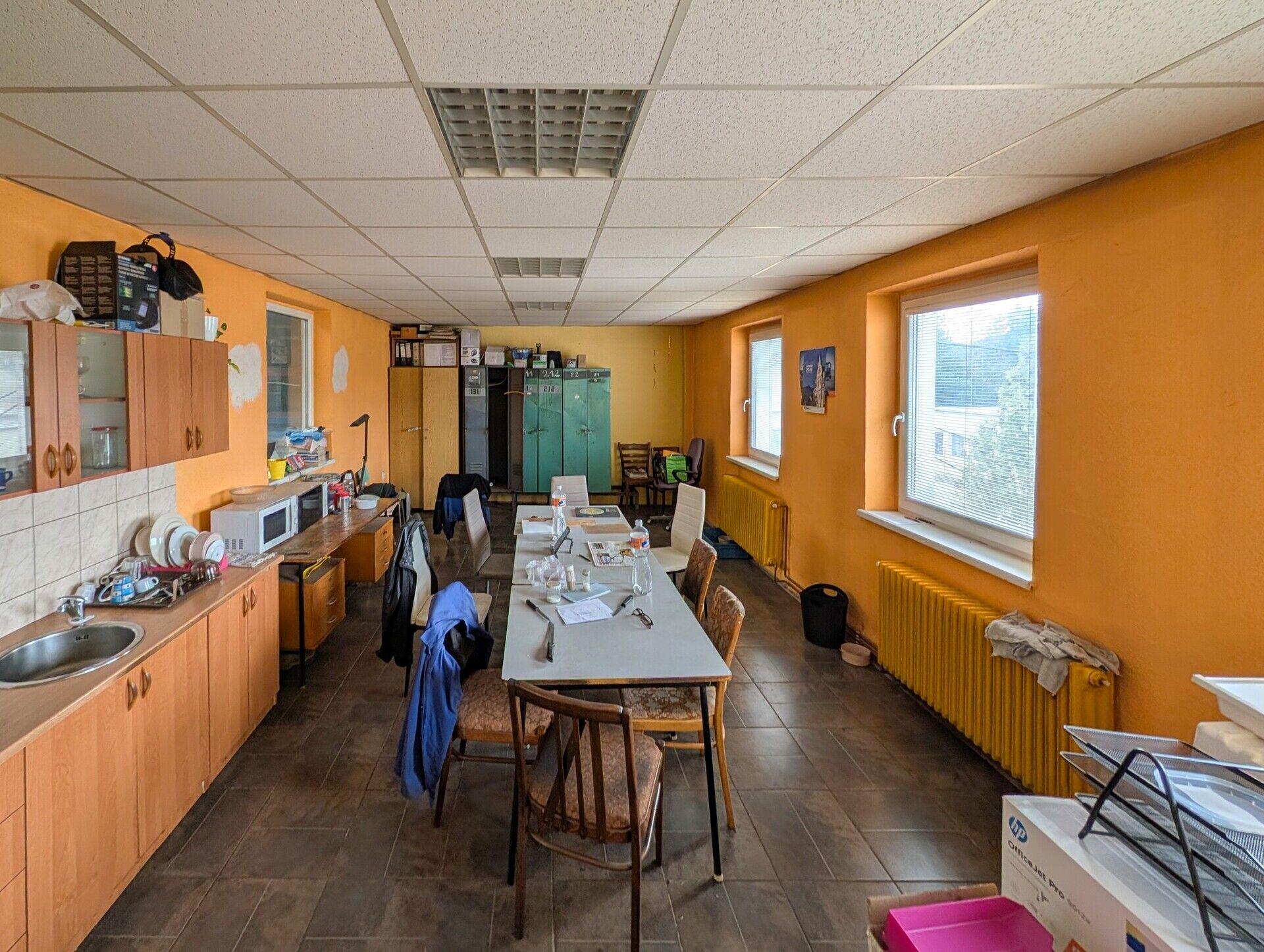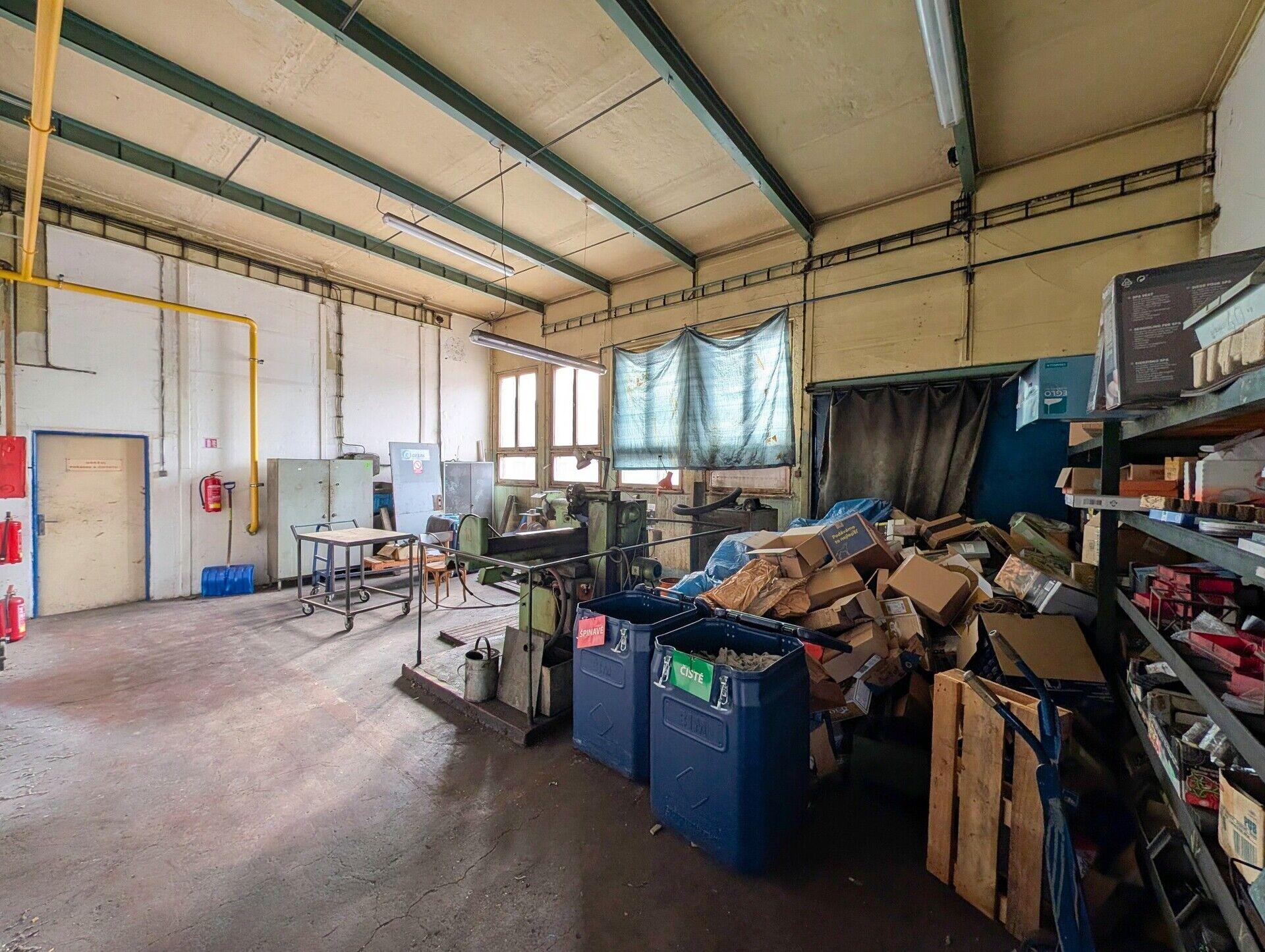 Dílny, sklady: přízemní objekt; celková zastavěná plocha 408,30 m2; ocelová konstrukce; opláštění s typizovanými panely; světlá výška 4,05 m; zahrnuje dílny, sklady, kancelář mistra; betonová podlaha; vytápění plynovými Saharami; vstup dvoukřídlými vraty (2,9 x 2,6 m) v úrovni terénu a dvoukřídlými vraty (2,9 x 3,3 m) na nakládací rampě (výška rampy 0,55 m).