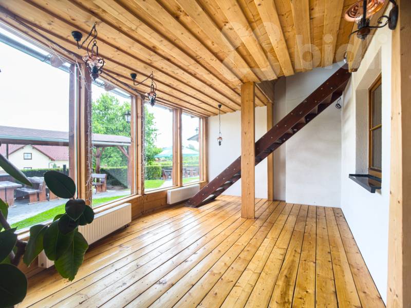 Na pozemku je zastřešená pergola s posezením pro dalších 56 hostů, stoly s výčepním zařízením, dále pergola s venkovním barem a grilem. Na zahradě je také bazén, dětské hřiště, dřevěné pódium. V zadní části zahrady je vinný sklípek a zahradní domek sloužící jako další bar s krytým posezením.