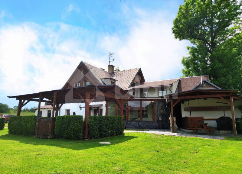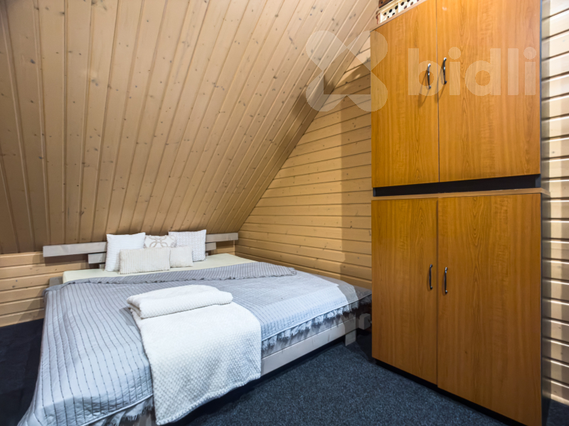 Ubytovací část s kapacitou pro 15 hostů: v přízemí je společenská místnost s krbovými kamny, kuchyně s jídelním stolem, v horním patře jsou další 4 samostatné pokoje, WC a velká koupelna se 2 sprchovými kouty a umyvadly. Součástí je také garáž, úschovna jízdních kol i lyží.