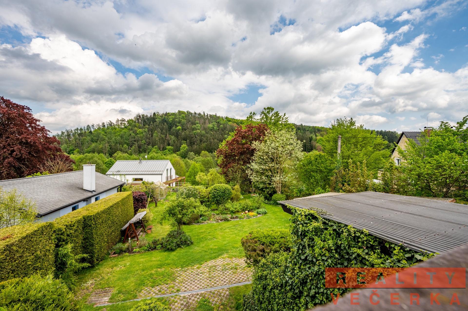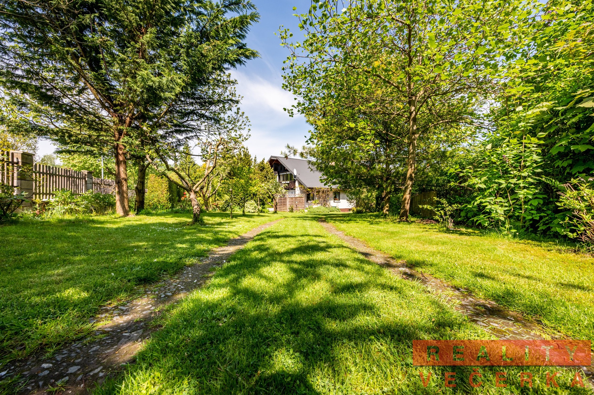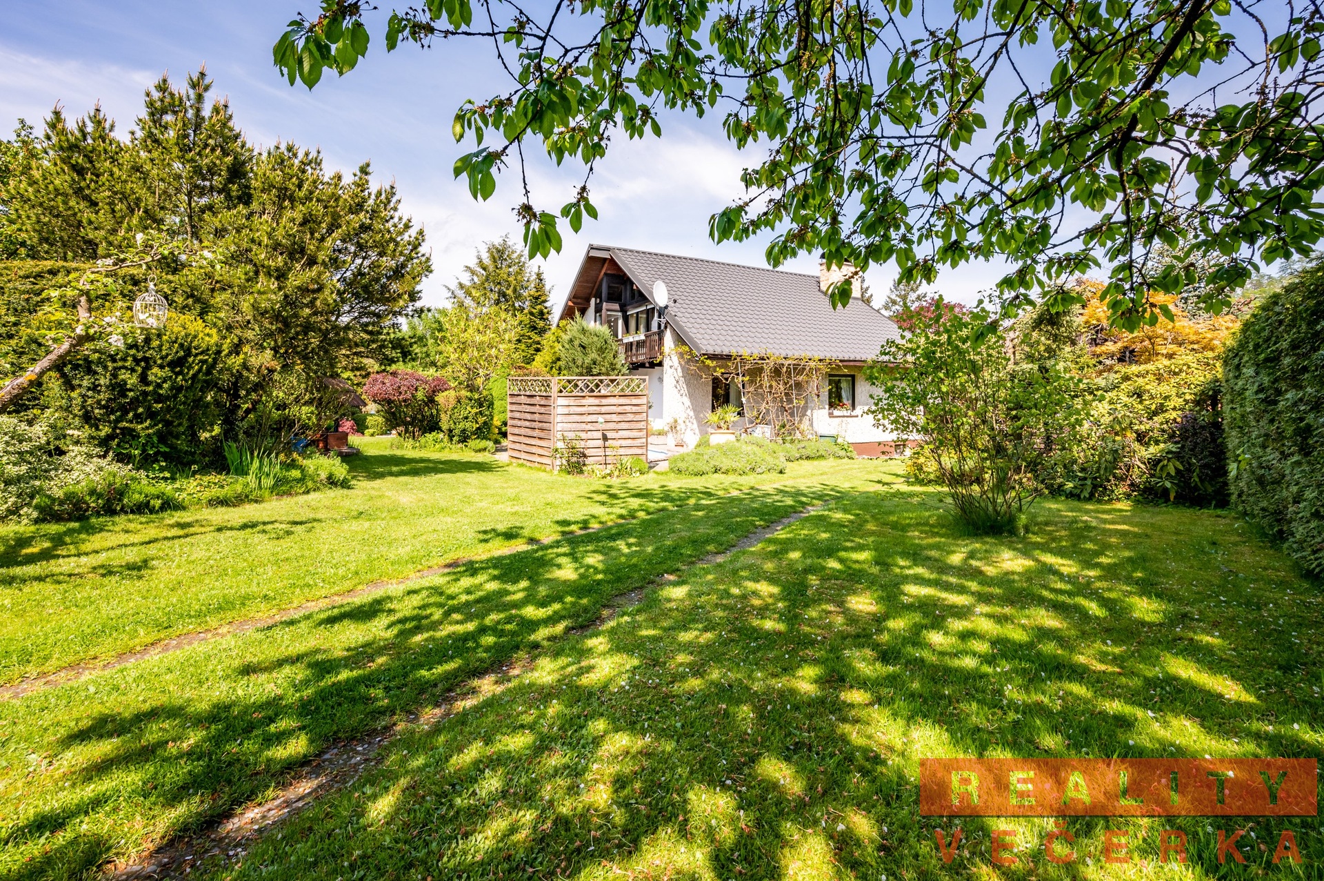 Dům obklopuje zahrada s květinami, okrasnými keři a ovocnými stromy. Její úprava svědčí o trvalé péči.