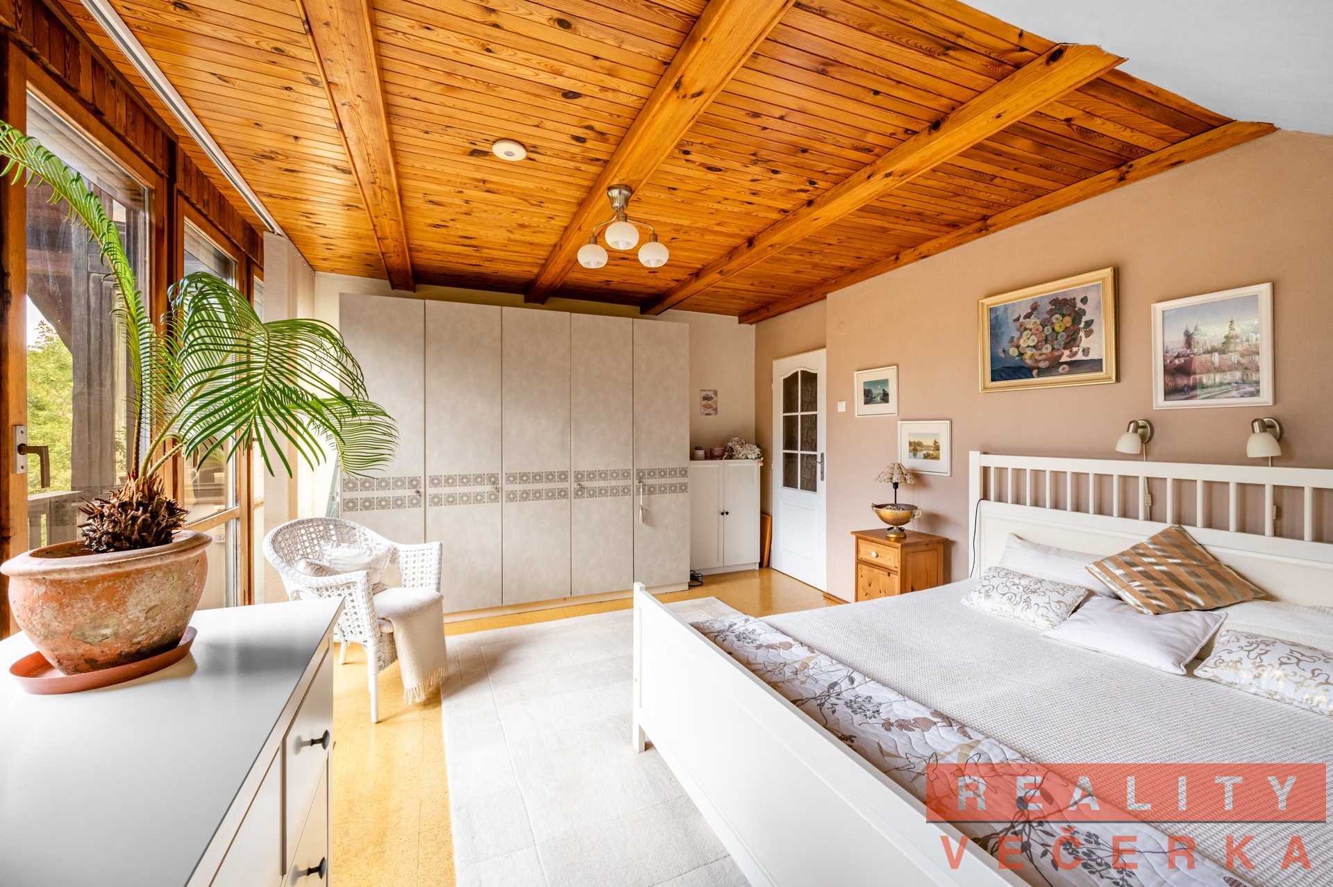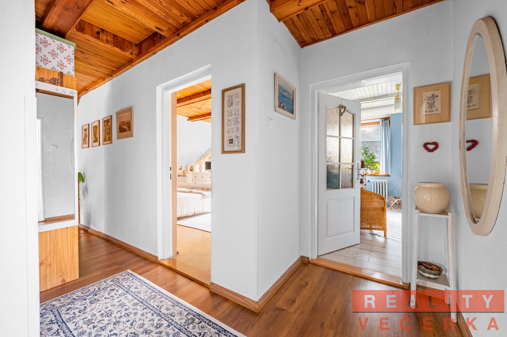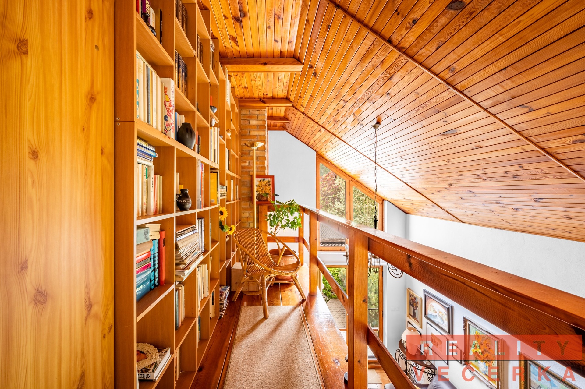V podkroví jsou tři pokoje (ložnice), dva z nich mají balkon. Prostory přízemí a podkroví jsou úmyslně propojeny galerií, která umožňuje být v kontaktu s děním v přízemí. Z toho důvodu nemá hala v přízemí strop, to umocňuje velikost přízemních prostor a to i díky prosklenému štítu.