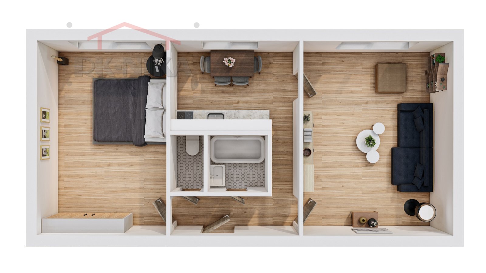Byt je ve velmi dobrém, udržovaném stavu a nabízí praktické dispoziční řešení. Skládá se z předsíně, kuchyně, obývacího pokoje, ložnice, koupelny a samostatného WC. V obývacím pokoji a ložnici jsou zachovalé parkety, které mohou po úpravě dodat interiéru příjemnou atmosféru.