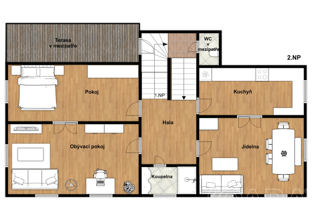 V mezi patře (1NP / 2NP) je vstup na krytou terasu z modřínu. Druhé podlaží tvoří prostorná kuchyně a tři světlé pokoje (dispozice 3+1). Kuchyně disponuje vestavěnými spotřebiči. Kombinace tří pokojů je možné využít jako obývací pokoj / jídelnu / pracovnu (pokoj pro hosty). Na druhém patře je i koupelna s dvěmi umyvadly a prostorným sprchovým koutem.