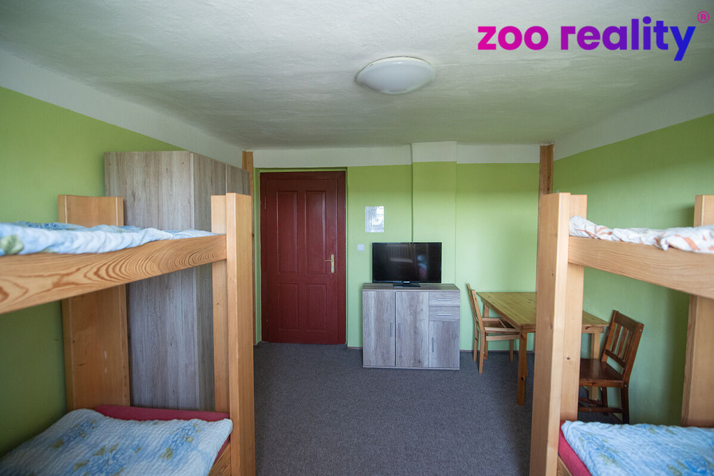 Nabízíme prodej rodinného domu přestavěného na ubytovací zařízení. Nemovitost se nachází v centru městyse Ševětín, nedaleko od Českých Budějovic. Jedná se o dvoupatrový dům s přístavbou. V přízemí se nachází samostatný byt 2+kk s koupelnou a WC, prostorná kuchyně, dva pokoje dohromady s 9-ti lůžky a přístavba, která slouží jako sociální zařízení pro celý objekt. Toto zařízení se skládá s 5x WC a 5 x samostatná sprcha. V zadní části objektu je technická místnost.