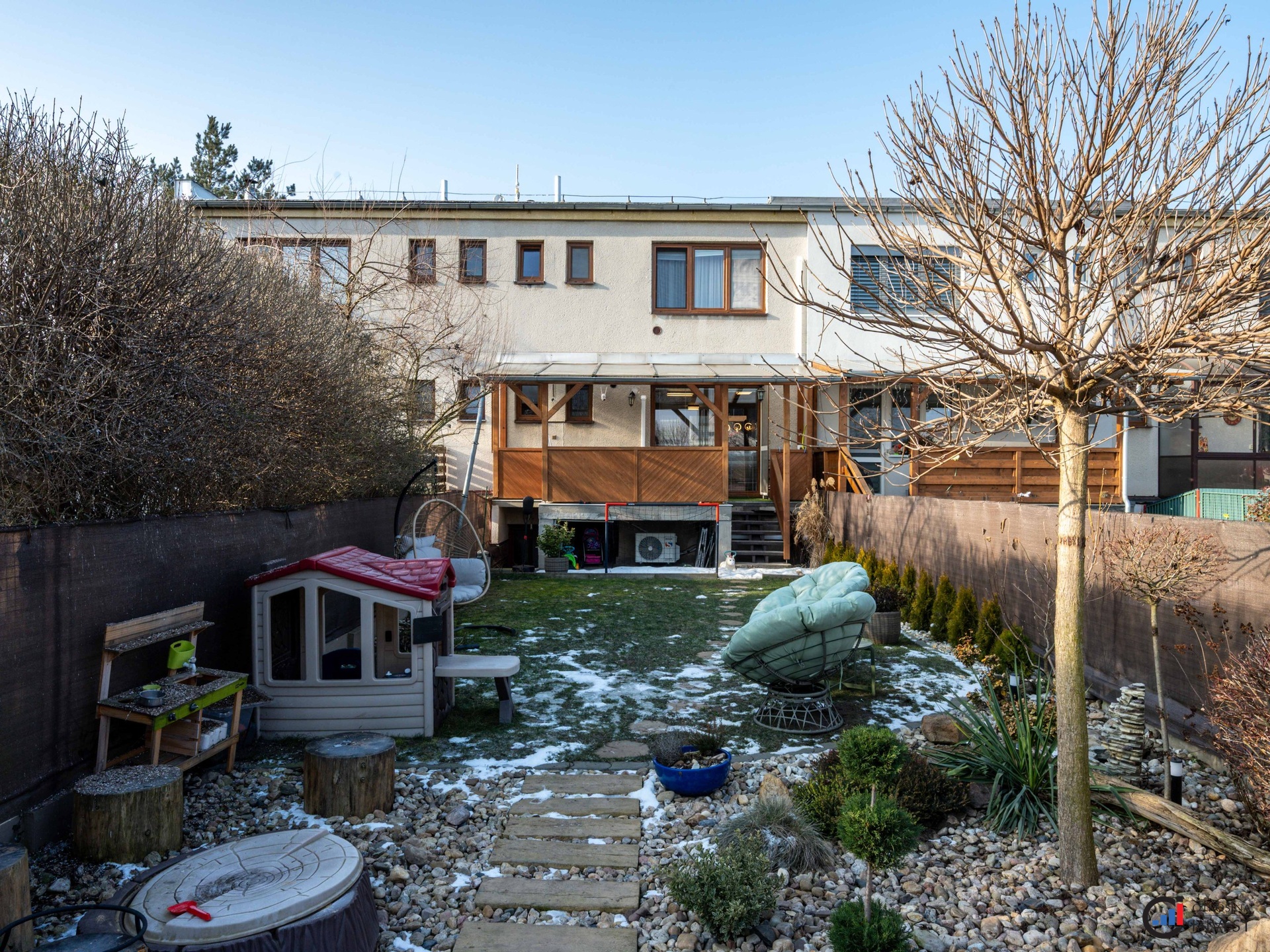 Upravená zahrada se zahradním domkem a terasou poskytuje příjemné zázemí pro odpočinek i rodinné posezení.
