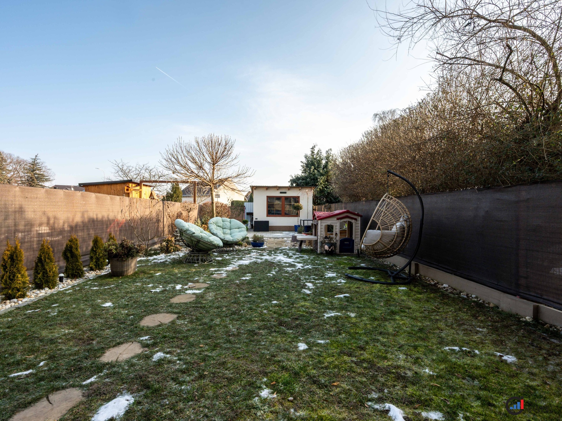 Upravená zahrada se zahradním domkem a terasou poskytuje příjemné zázemí pro odpočinek i rodinné posezení.