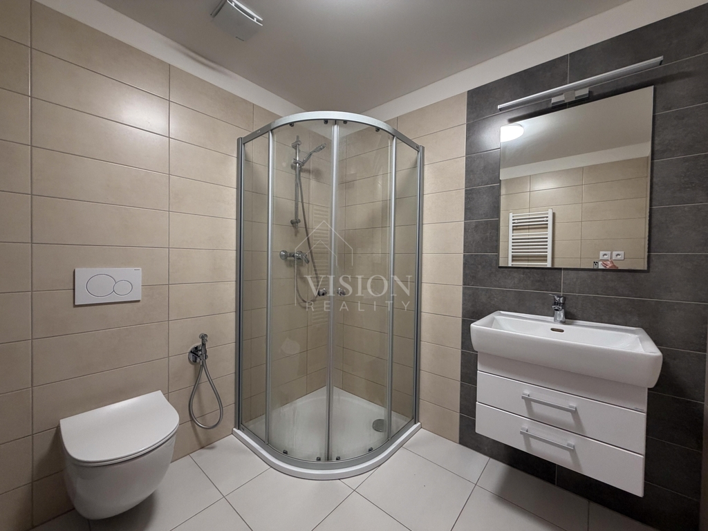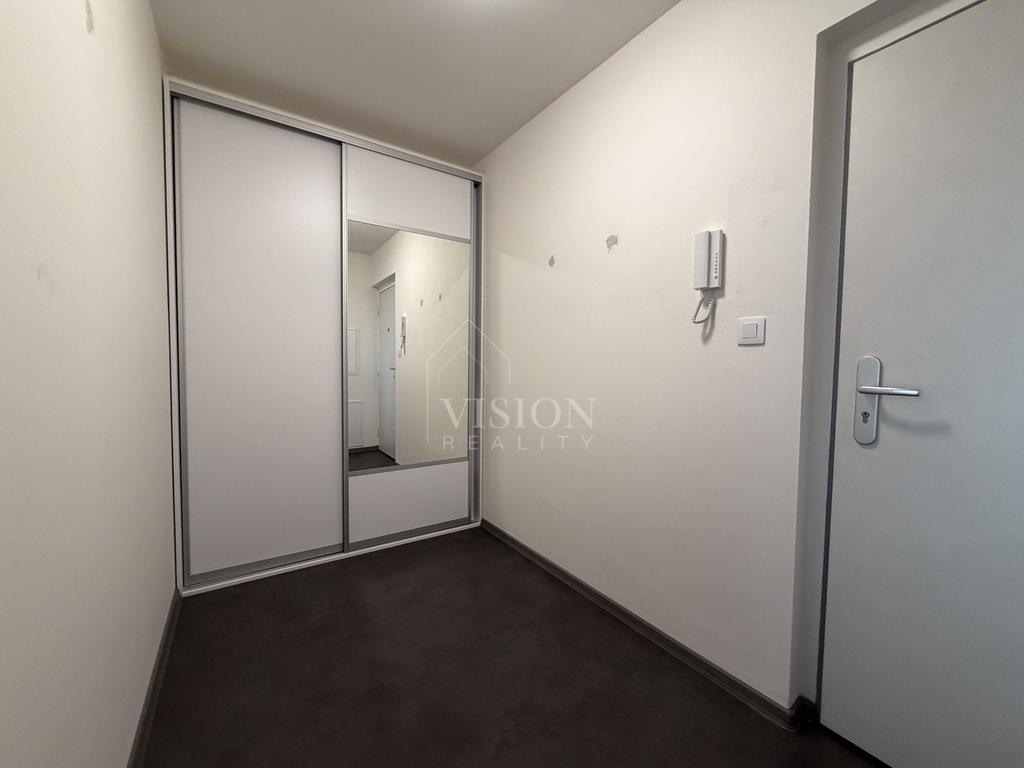 V prostorné a moderně řešené koupelně najdeme sprchový kout. V celém bytě je dlažba a v chodbě je praktická velká skříň a stále dostatek místa na doplnění nábytkem dle vlastních představ. Byt tak nabízí opravdu hodně úložného prostoru a interiér bude stále působit minimalisticky.