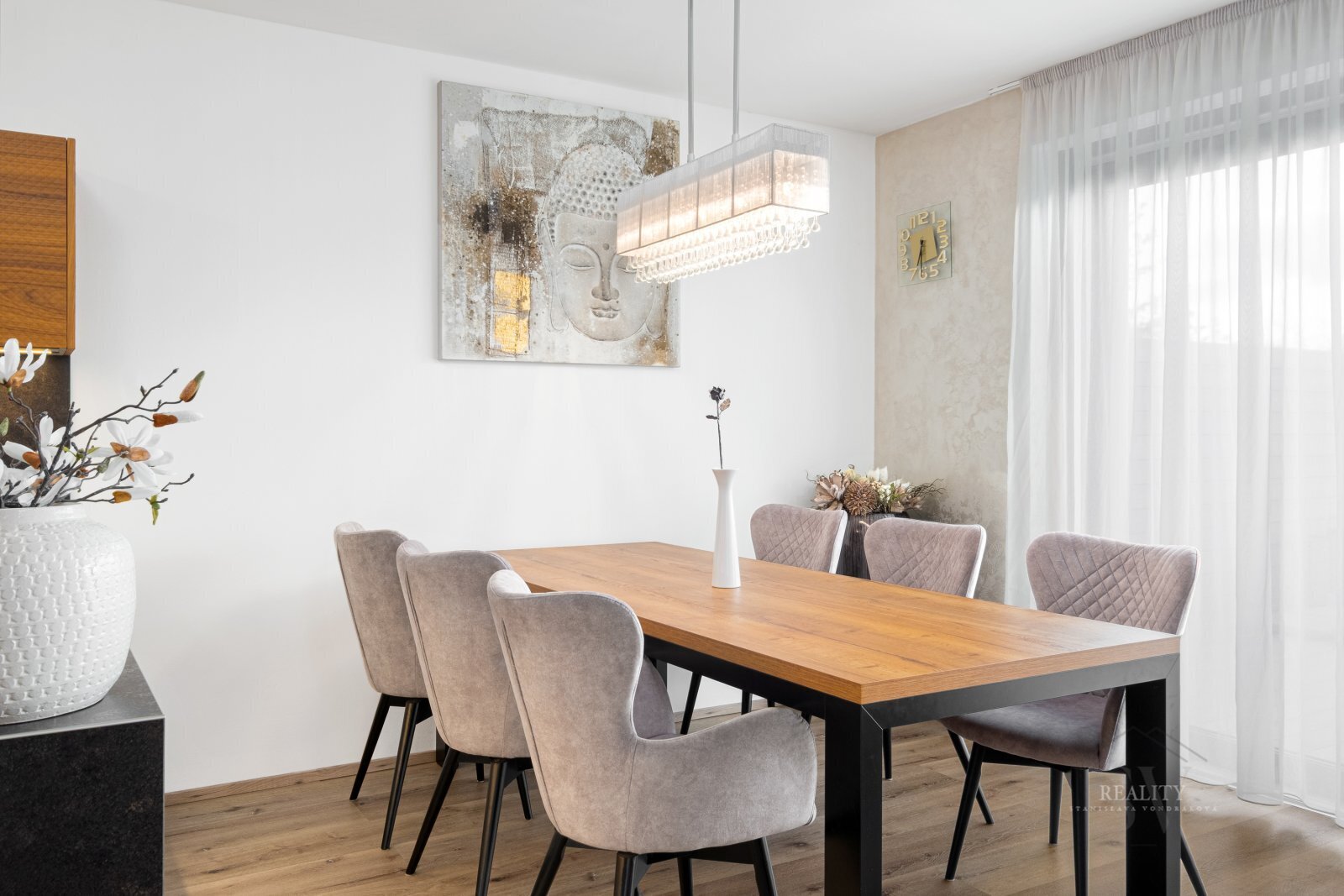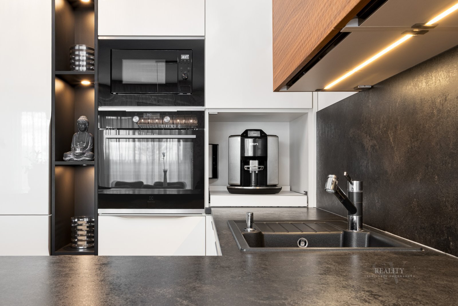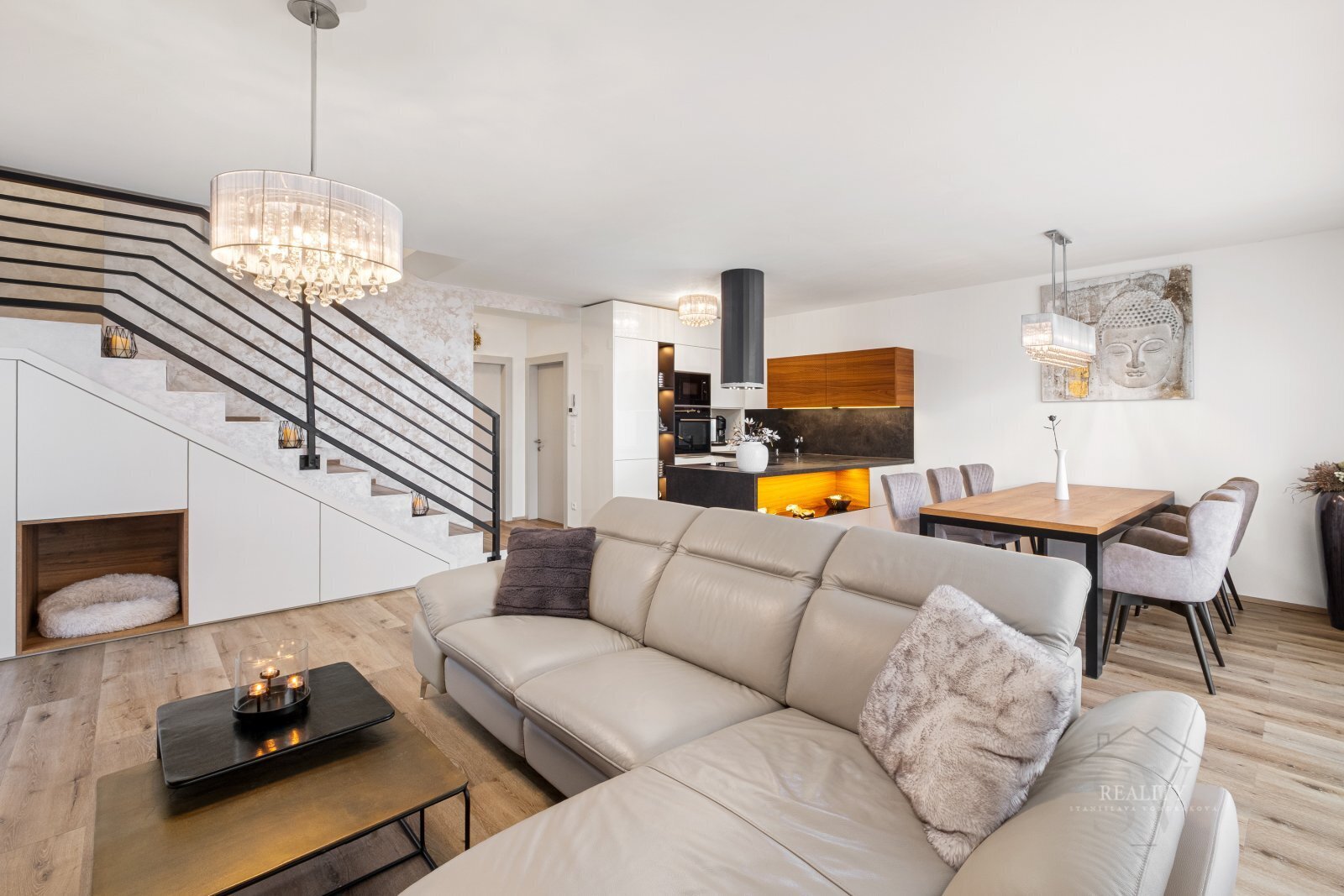 Dominantou přízemí je prostorný obytný prostor s plynulým propojením kuchyňské, jídelní a obývací části. Luxusní kuchyňská linka značky Sykora byla navržena na míru a je vybavena prémiovými vestavěnými spotřebiči.