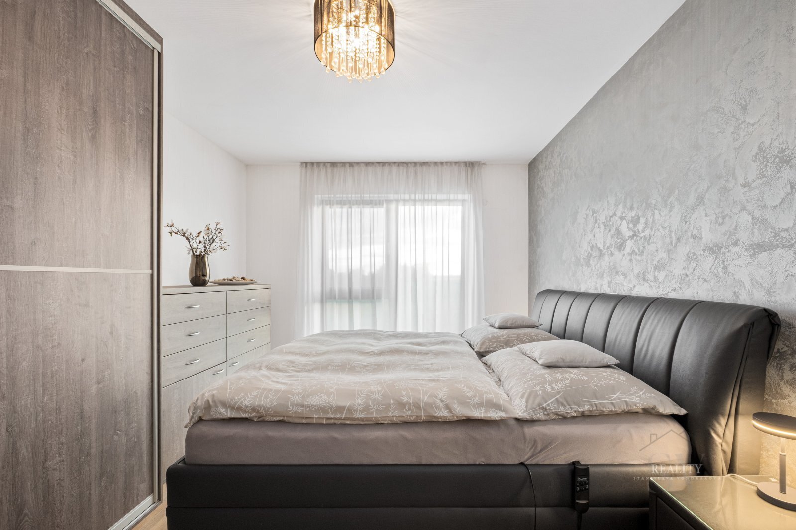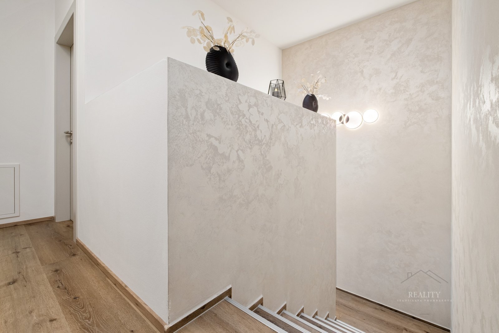 Interiér podtrhují luxusní dekorativní stěrky, vestavěné skříně a designové schodiště s prakticky řešeným úložným prostorem.