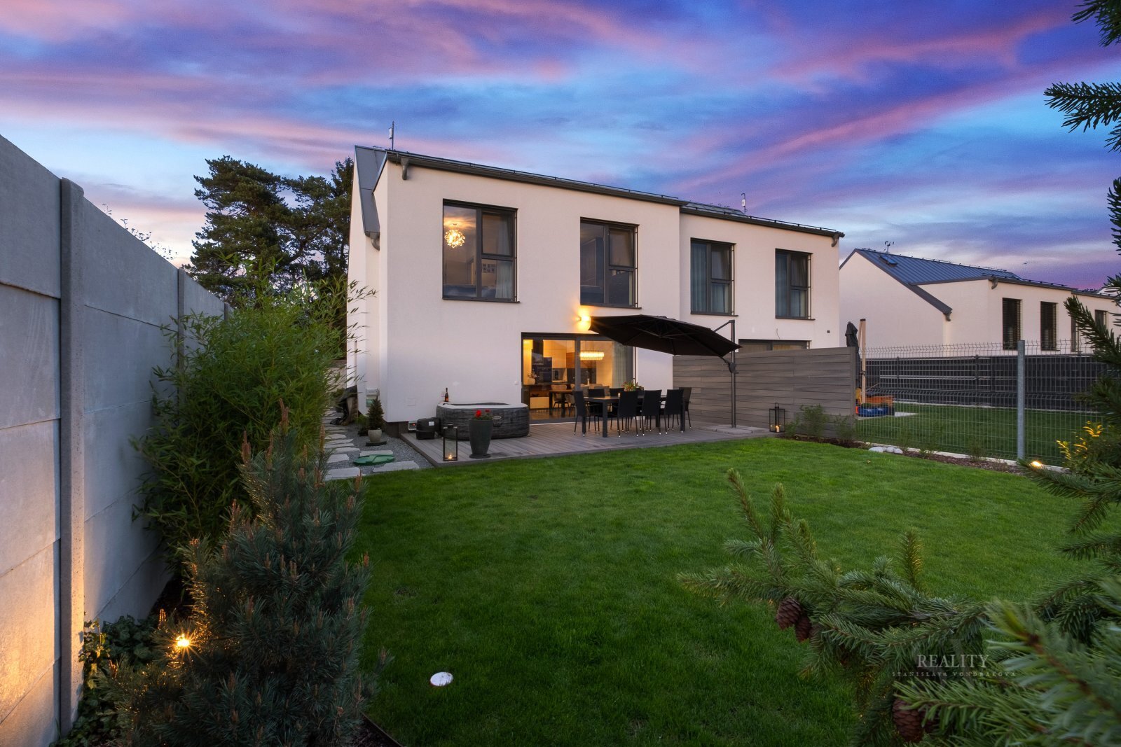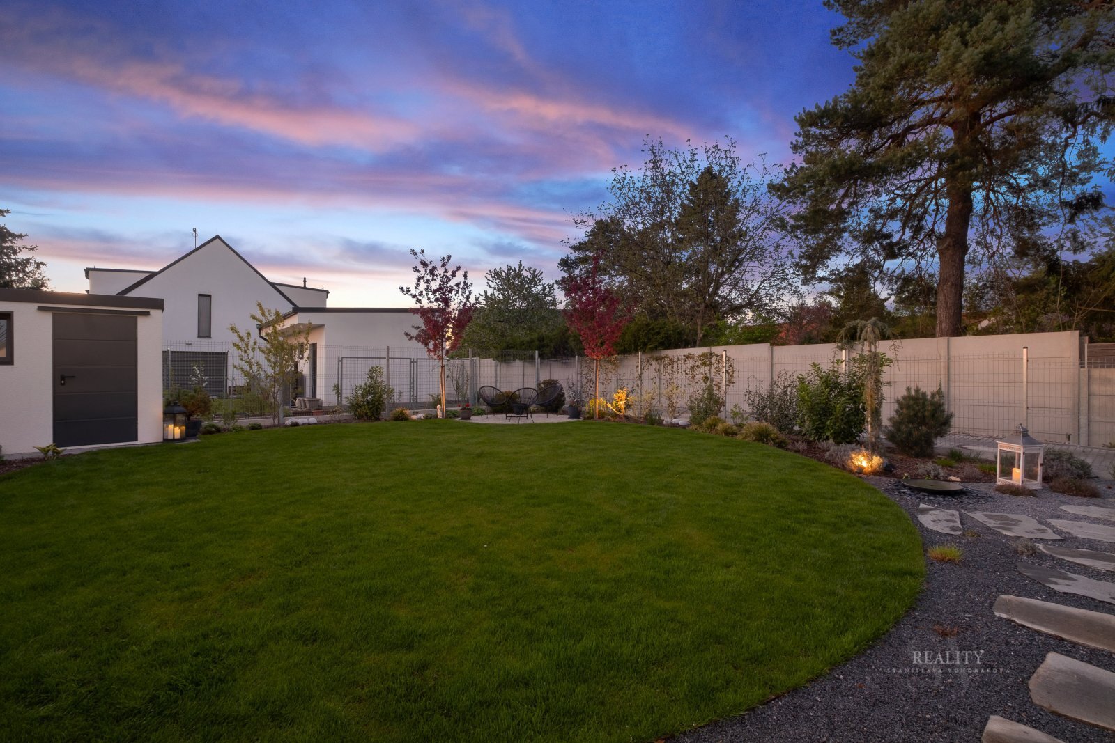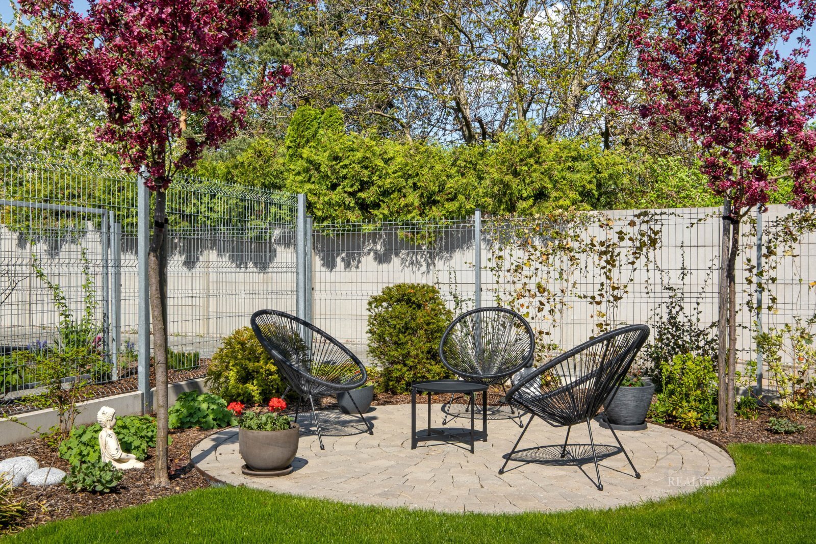 Zahrada je členěna do relaxačních zón a vybavena automatickým zavlažovacím systémem, který zajišťuje minimální nároky na údržbu.