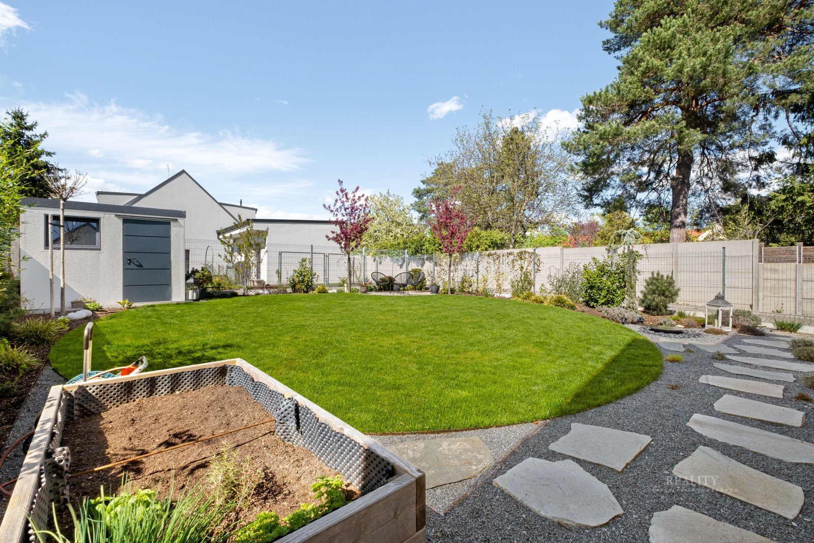Pečlivě upravená zahrada byla realizována dle návrhu zahradního architekta a nabízí ideální kombinaci estetiky a funkčnosti.