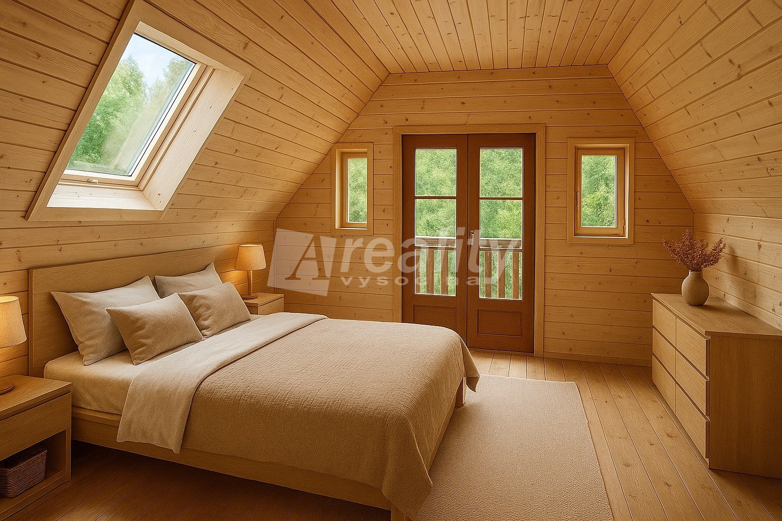 Dispozice nabízí příjemné přízemí se dvěma místnostmi, předsíní a vstupem na terasu. Odtud se dostanete do prostorného podkrovního pokoje s lodžií a krásným výhledem do zeleně – ideální prostor pro odpočinek i nocování.