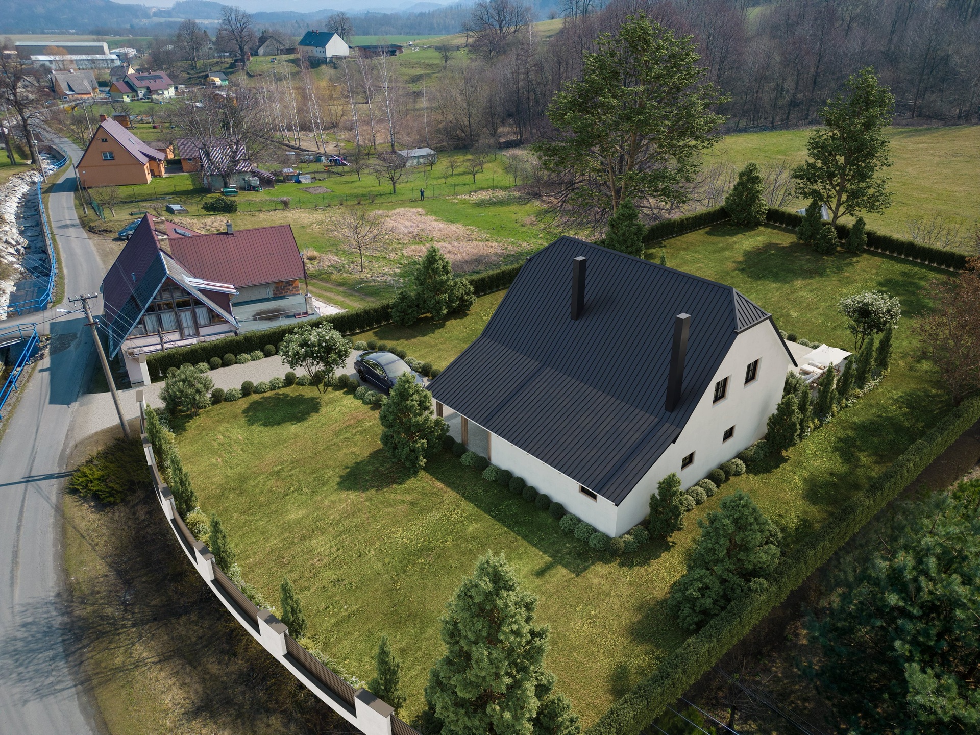 Dům svou stavbou zabírá hodně místa, ale tato varianta je perfektně vyřešena díky velké zahradě s výměrou 1928m2, na které vám zbyde spoustu místa k výstavbě bazénu, zahrádky a nebo dalších parkovacích míst.