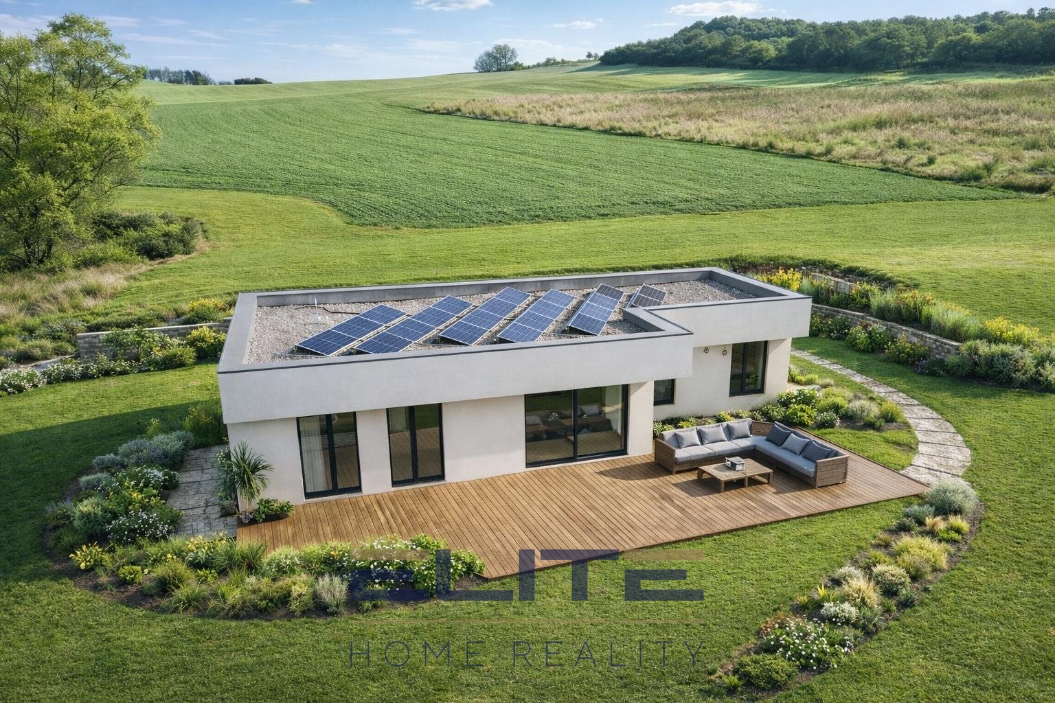 Na střeše je instalována fotovoltaická elektrárna, která přispívá k energetické soběstačnosti domu a výrazně snižuje provozní náklady.
