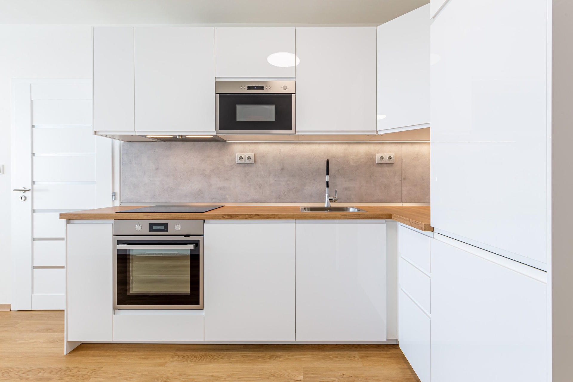 Nová kuchyňská linka včetně vestavěných spotřebičů (myčka, horkovzdušná trouba včetně indukční varné desky, lednice, digestoř, mikrovlnná trouba), LED osvětlení pracovní desky, nerezový kuchyňský dřez, dřezová stojánková baterie s elastickým ramenem.