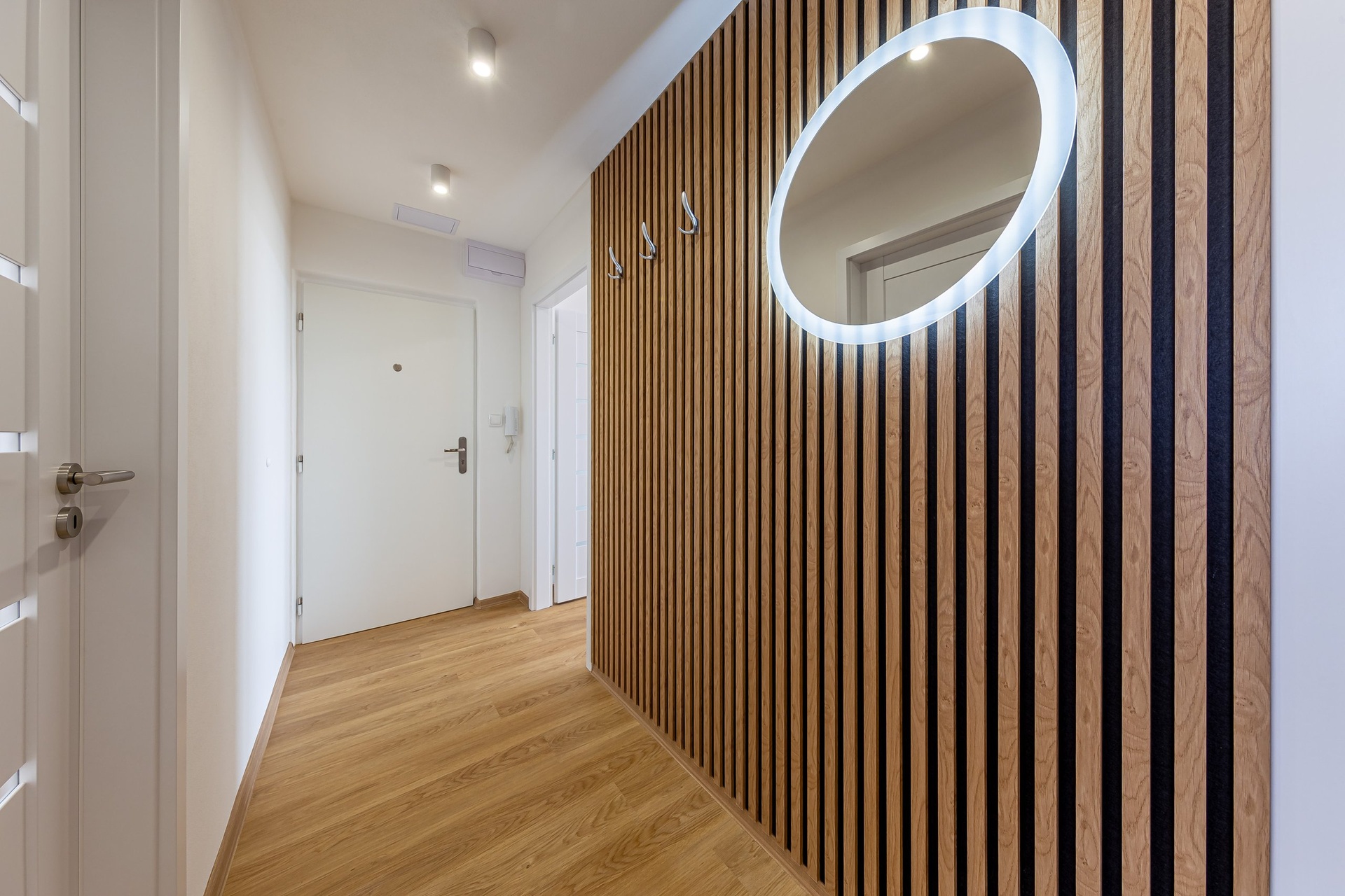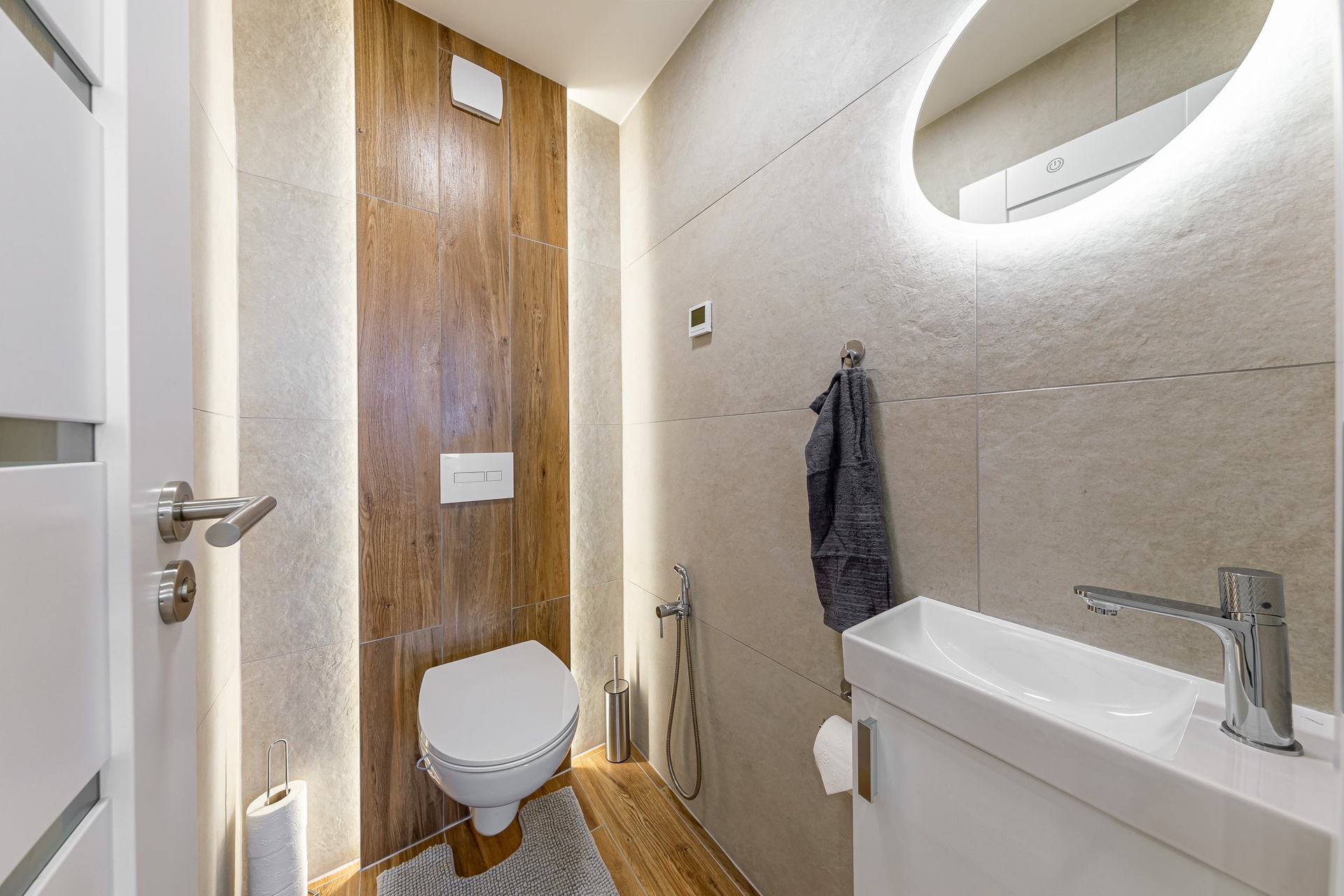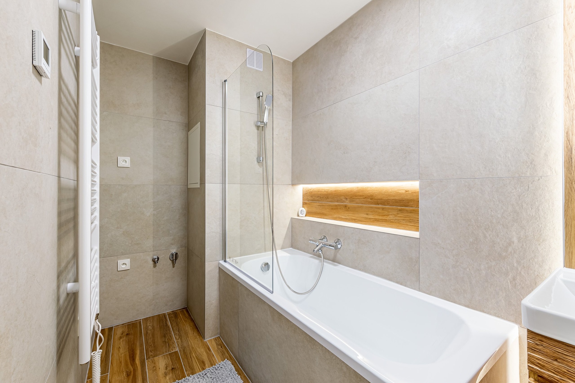V bytě je nová elektroinstalace včetně revize, nové zásuvky a vypínače, nové rozvody vody a odpadů, koupelna s vanou včetně skleněné zástěny, koupelnová skříňka s umyvadlem včetně baterie, LED zrcadlo, LED osvětlení panelu včetně niky v koupelně, elektrický koupelnový radiátor, podlahové vytápění v koupelně a na WC, vestavěné WC, umývátko se skříňkou, bidetová sprška, LED zrcadlo, LED osvětlení panelu, ventilátor, nové horizontální žaluzie, vinylové podlahy, LED osvětlení celého bytu, akustické panely na chodbě a obývacím pokoji, nové interiérové dveře a zárubně, protipožární dveře.