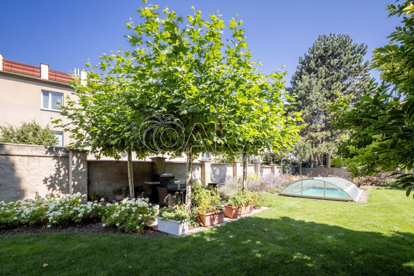 Kromě travnatých ploch a okrasných dřevin zde naleznete také grilovací pergolu a vyhřívaný krytý bazén s tepelným čerpadlem.