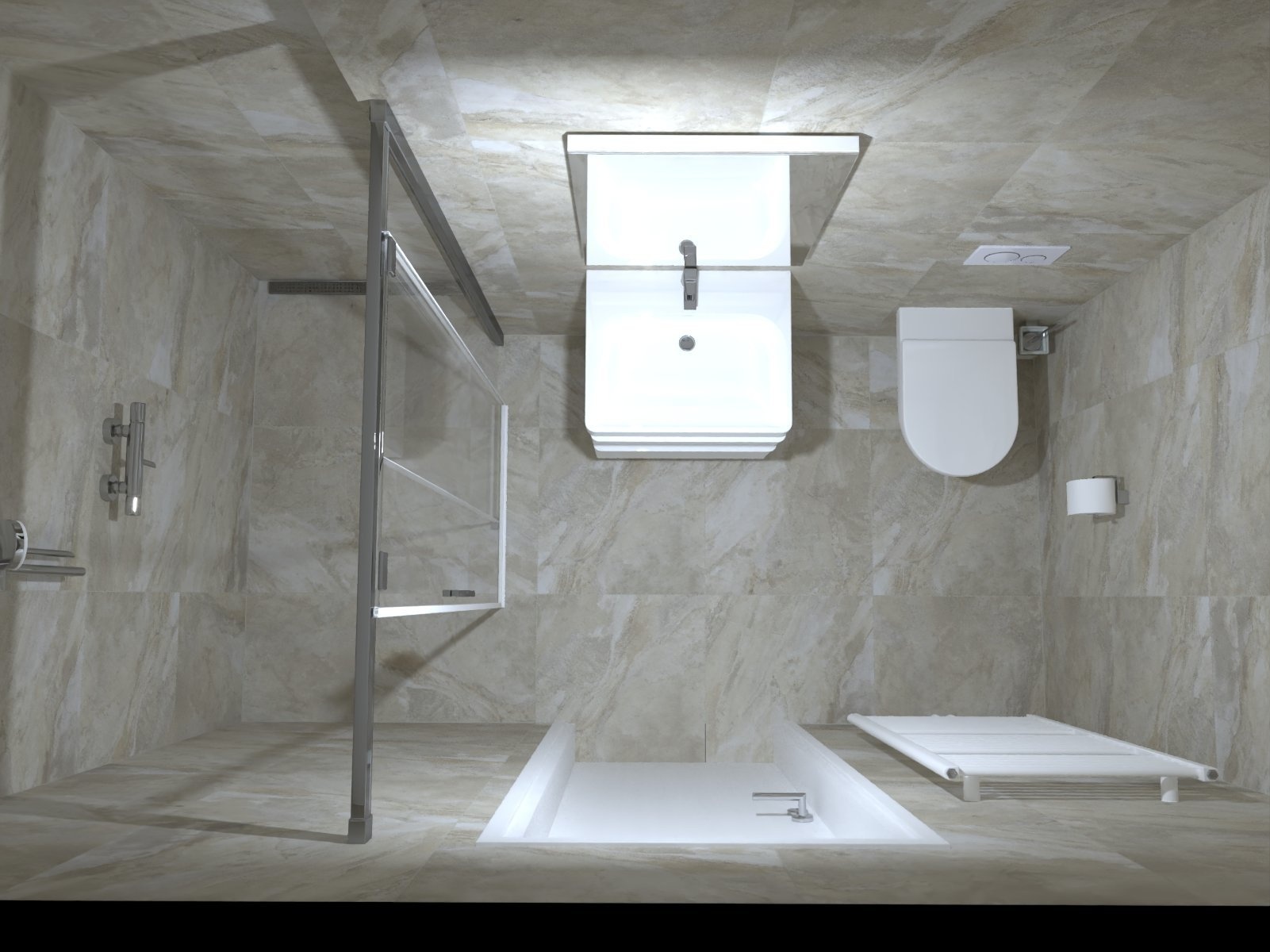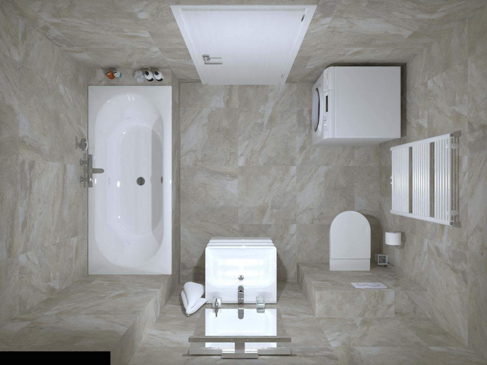 - sanitární technika, 2x umyvadlo včetně baterie, 2x vana, 3 x závěsné WC, zrcadla, obklady - mramor