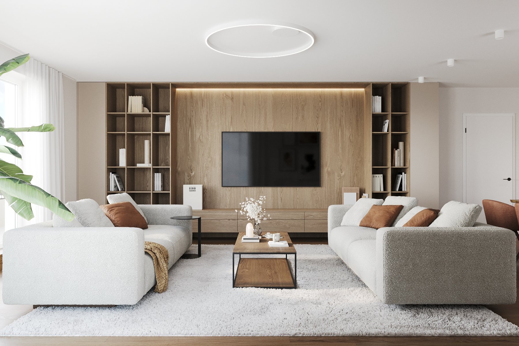 Dispozice: chodba 11,61m2, obývací pokoj s kuchyňským koutem 45,04m2, ložnice 15,69m2 s koupelnou s vanou včetně WC 4,09m2, dětský pokoj 20,54m2 a druhý dětský pokoj 15,99m2 se vstupy na balkon 10,5m2, koupelna s vanou včetně WC 5,69m2, technická místnost 3,17m2 a WC zvlášť 1,65m2. Z obývacího pokoje a ložnice je vstup na terasu o výměře 17,35m2.