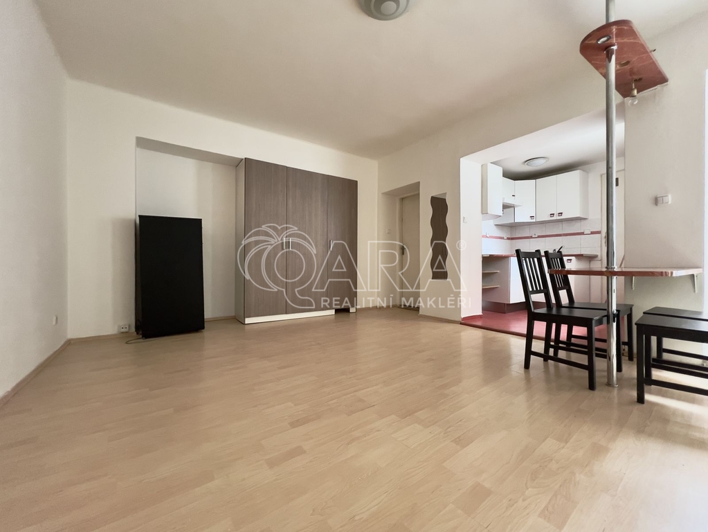 Bytová jednotka o podlahové ploše 39 m² se nachází ve 2. nadzemním podlaží budovy, kde se jsou pouze tři bytové jednotky. Skládá se ze zádveří, ze kterého je přístupná obytná část, kde je z nábytku pouze komoda a šatní skříň, jinak si pokoj můžete zařídit podle svých vlastních představ. Z pokoje je vstup na balkón, který je orientovaný do klidného vnitrobloku. Dále je k dispozici menší kuchyňská linka s dvouplotýnkovým vařičem (další spotřebiče nejsou součástí nájmu). Z kuchyně je přístupná koupelna se sprchovým koutem, umyvadlem a WC a přípojkou na pračku.