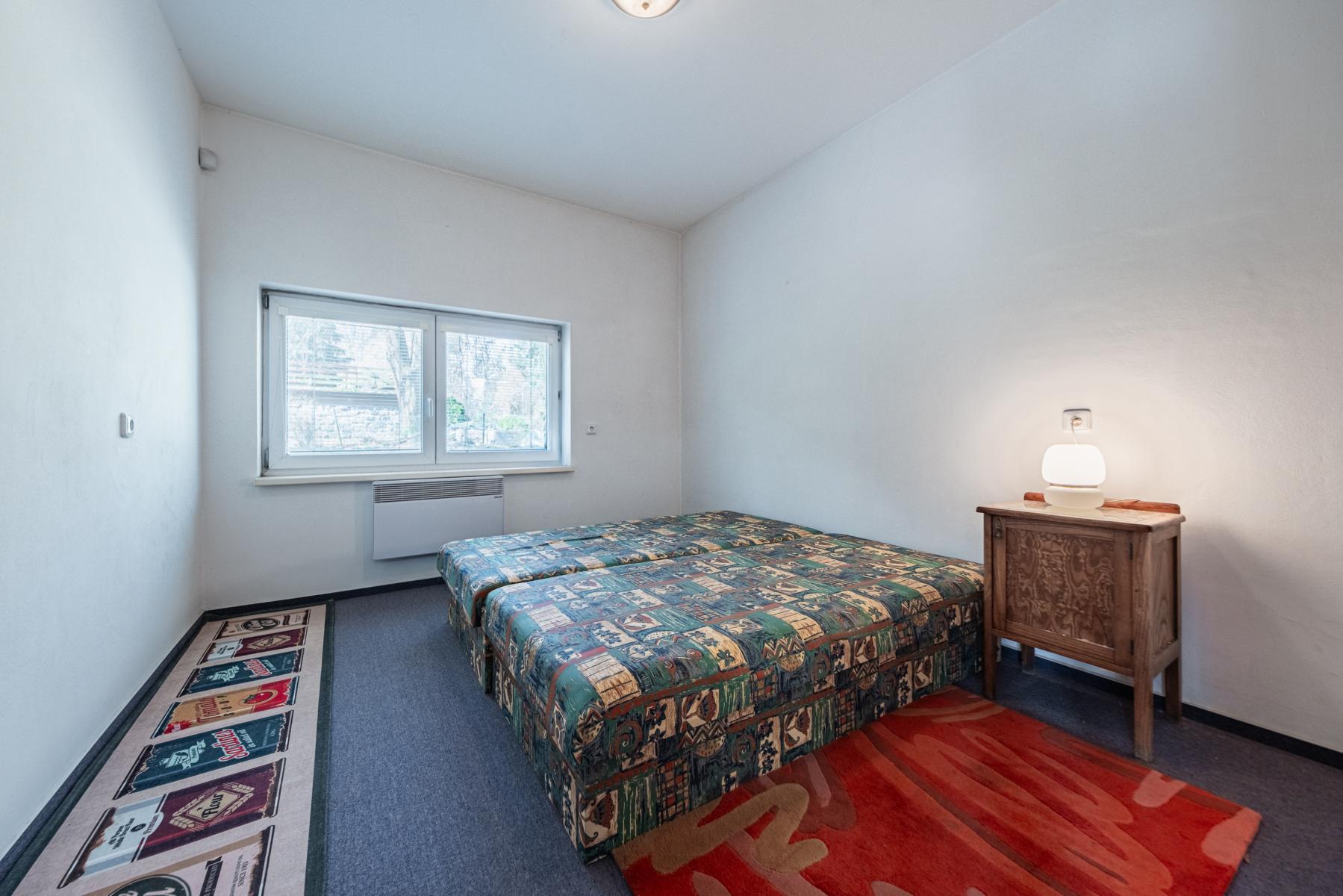 Byt je velmi dobře dispozičně řešen, prostorný obývací pokoj s kuchyňským koutem s přímým výhledem do zahrady o velikosti 24,79 m and sup2;, pokoj 10.10 m and sup2;, pokoj 11 m and sup2;, koupelna a WC 4,70 m and sup2;, předsíň 3,44 m and sup2;. Vybavení bytu je součástí kupní ceny. Celý objekt je oplocen, na rozlehlé zahradě se nachází venkovní posezení s grilem pouze pro obyvatele domu.